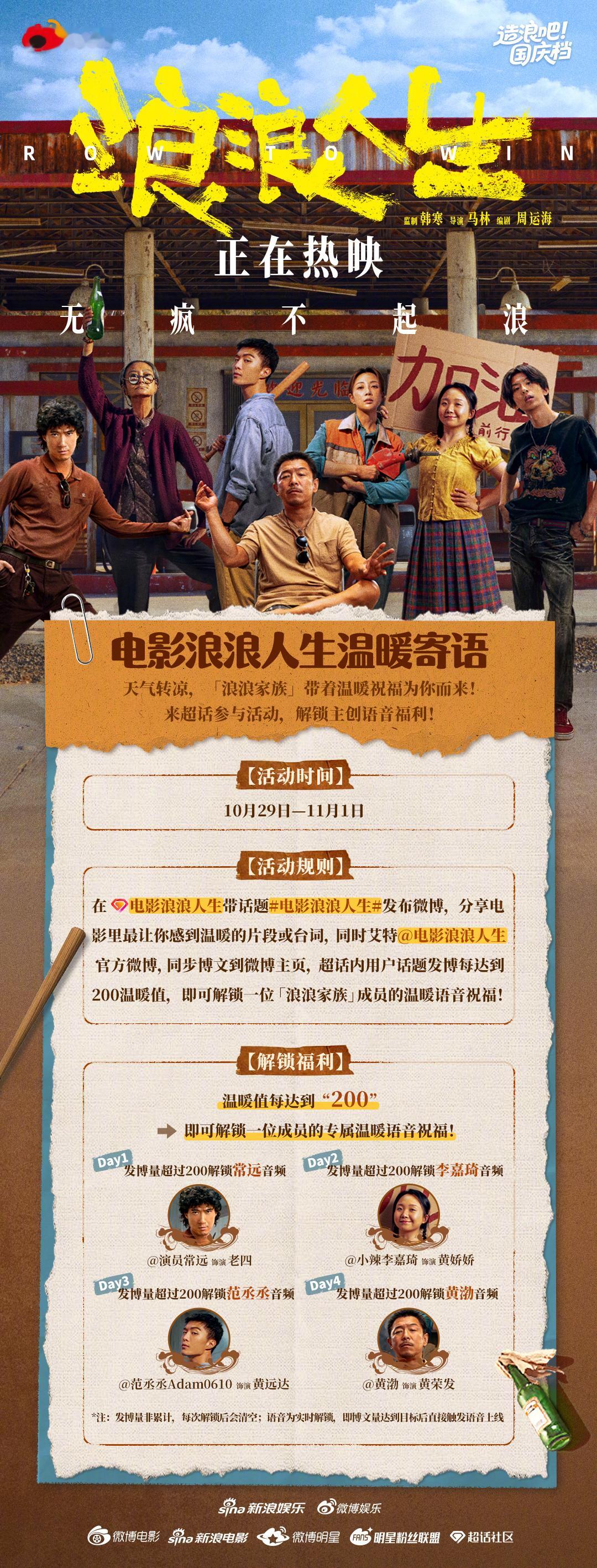 电影《浪浪人生》正在热映中,「浪浪家族」主创超话惊喜语音待解锁🔓。即日起,进入电影浪浪人生[超话]带话题电影浪浪人生发博,分享观后感或印象深刻的片段/台词。发博每达200温暖值,即可解锁主创黄渤、范丞丞、李嘉琦、常远主创的惊喜暖冬问候~快来参与吧!造浪吧国庆档