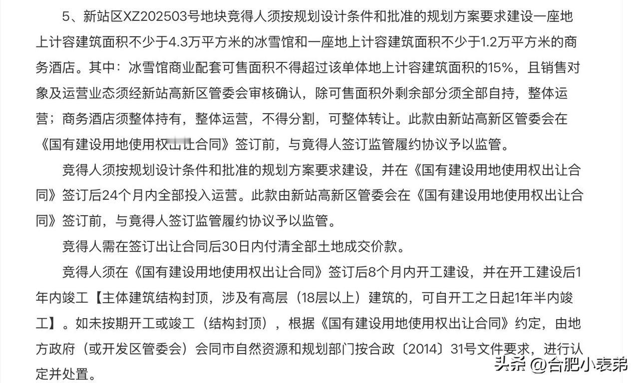 地块坐落于东方大道与铜陵北路东北角,占地约66.19亩,规划为商业用地,起拍价85万元/亩。根据要求,竞得人需配套建设地上计容建面≥4.3万㎡的冰雪馆,以及≥1.2万㎡的商务酒店,实打实的落地配置!之前多个区域的冰雪规划都不了了之,这次新站直接挂地推进,期待早日解锁合肥人的“家门口冰雪乐园”~[灵光一闪]