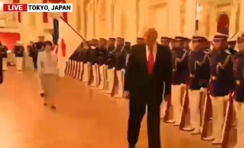 按照日本惯例,在欢迎仪式上,日本首相和外国领导人都会停下来,向两国的国旗鞠躬。但懂王根本不按照规矩来,就像图一一样,就对美国的国旗,敬个礼直接走了,留下日本首相一脸懵。川普不回头小快步的走,日本首相只能自己在国旗前鞠躬致意,再去追懂王。