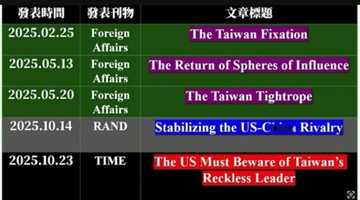 兰德智库最新报告:美国已无法战胜中国 Stabilizing The US-China Rivalry 2025年10月14日 主要内容: 1、美国必须撇弃美军能够战胜中国的信念,以目前的状态,美军已不可能战胜中国。美国取得胜利,在客观上就已经是不可能的。承认中国无法战胜是残酷的,但这也是被残酷的现实所迫,我们必须接受这个现实。如果美国还要尝试战胜中国,这将是灾难性的,将会威胁任何一方的生存。 2、要接受共存。美国要接受中国政党的合法性,中美在最高级官员中要广泛认同中美共存。某种程度的妥协必然是关系的一部分,双方都必须接受对方的政治合法性。 3、台湾。美国不仅要向中国保证“中国能够实现统一台湾的目标”。而且要利用美国对台湾的绝对影响力,坚决反对台湾台独,中美要交换信号,美国要坚决反对台独,而且不寻求海峡两岸永久分离,也绝对不反对中国和平统一台湾。美国还应尽最大努力推动中国渐进式和平统一台湾。赖清德声称台湾是一个主权独立的国家是不可接受的,美国应该限制赖清德破坏现状的一切活动。美国应该限制台湾不要再挑衅中国。 美国今年五个重磅报告见附件