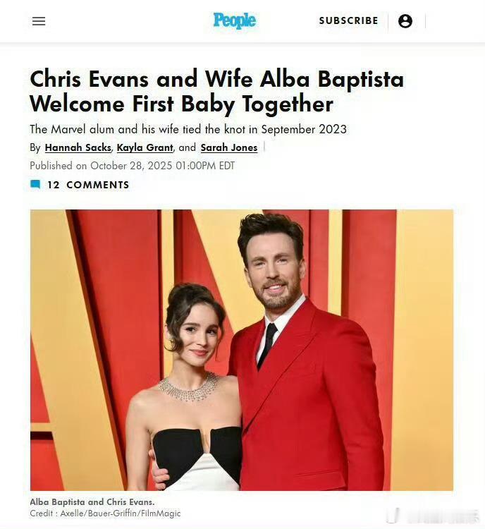 美队当爸爸近日,据外媒报道,消息人士证实,44岁的“美队”克里斯·埃文斯(Chris Evans)和妻子阿尔芭·巴普蒂斯塔(Alba Baptista)于10月24日迎来了两人的第一个孩子。美队要当爸爸啦!恭喜恭喜[打call]