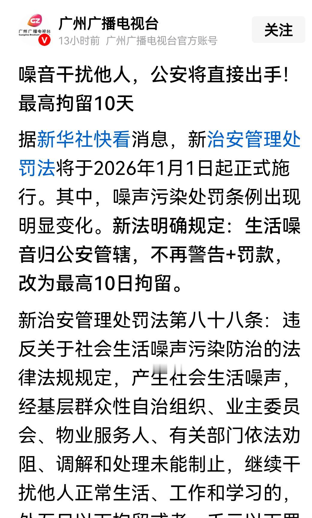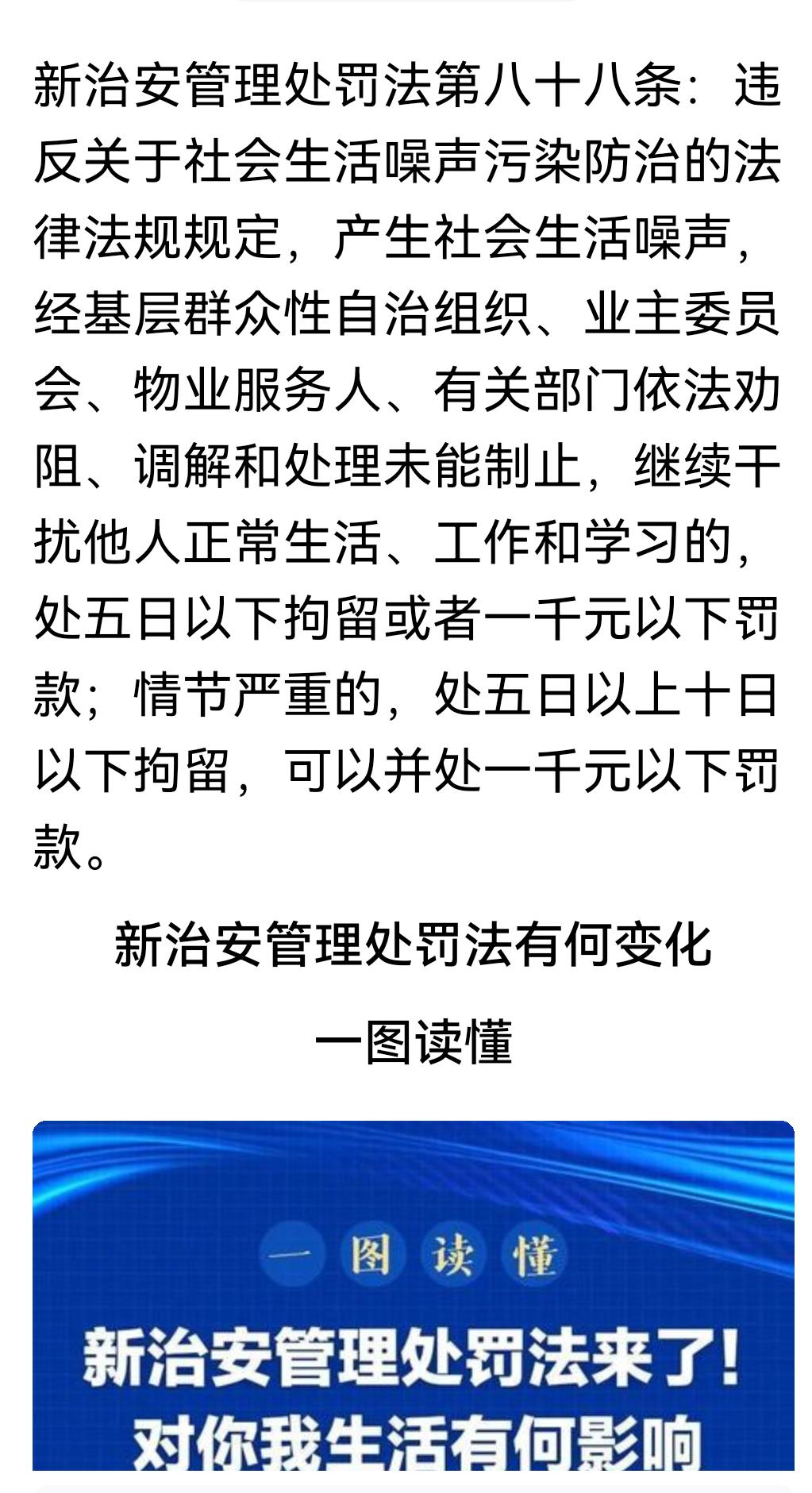 国家终于强力出手了,2026年一月一日起,居民将不会再受邻里噪音及养犬的干扰! 近几年,小区居民因为邻里噪音、养犬等问题闹矛盾的打架的 ,———甚至出人命的,已经屡见不鲜,严重影响邻里关系,成为严重的社会问题。 2026年1月1日新修订的《治安管理处罚法》施行后,邻里噪音和养犬问题终于有了更严格的治理办法。以前,楼上半夜电钻声、楼下高分贝广场舞音乐、宠物狂吠等噪音,常让人烦不胜烦,邻里为此闹矛盾甚至出人命的事屡屡发生。 新法规对噪音扰民处罚力度加大,最高可处10日拘留,还可能并处1000元以下罚款。处理不是直接罚,而是先由物业、居委会等基层组织劝阻、调解,没用再由相关部门处理。以后再遇到这些糟心事,居民也能有更硬气的保障啦!