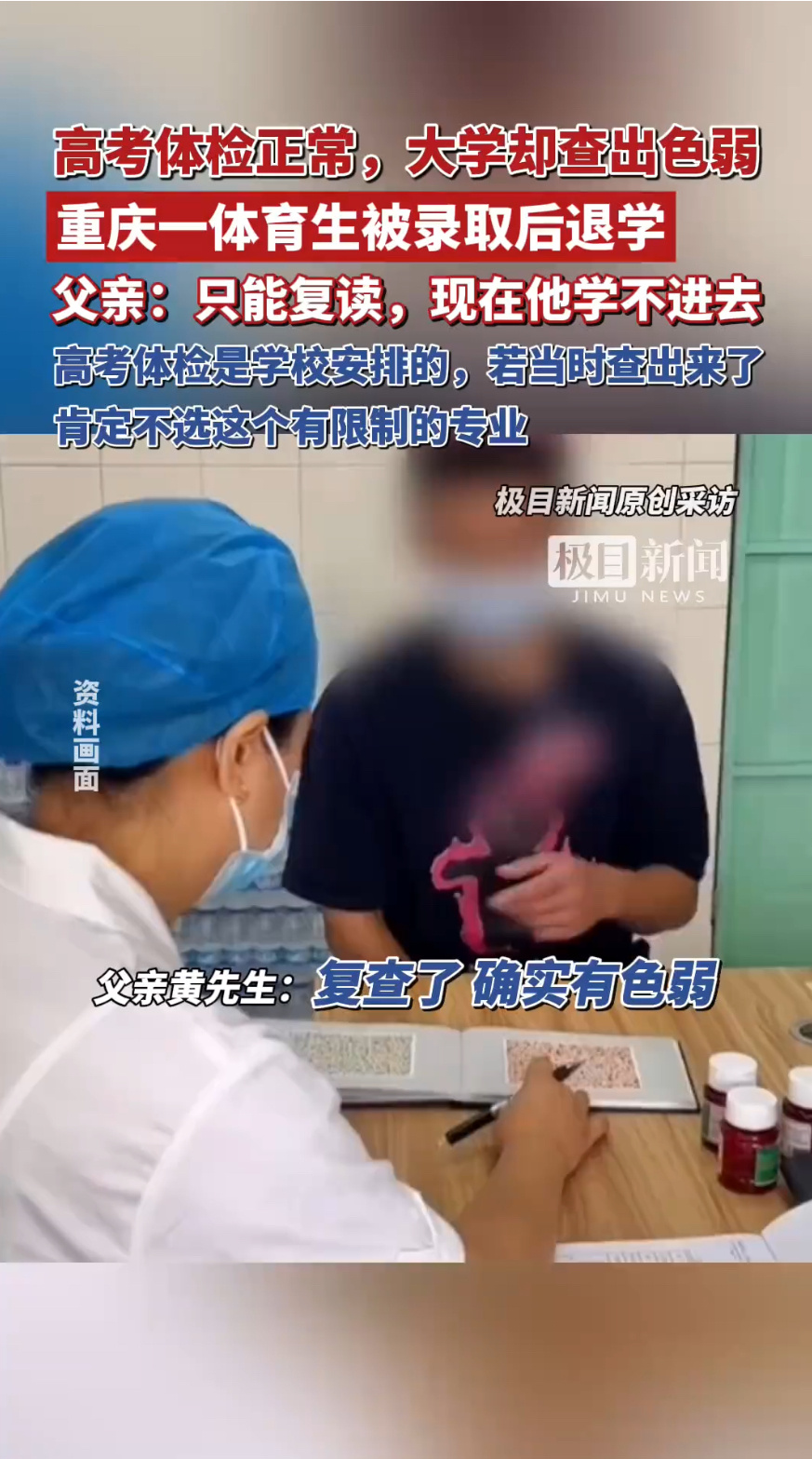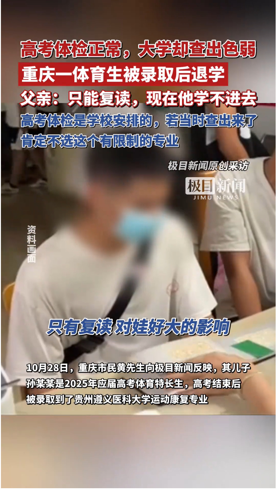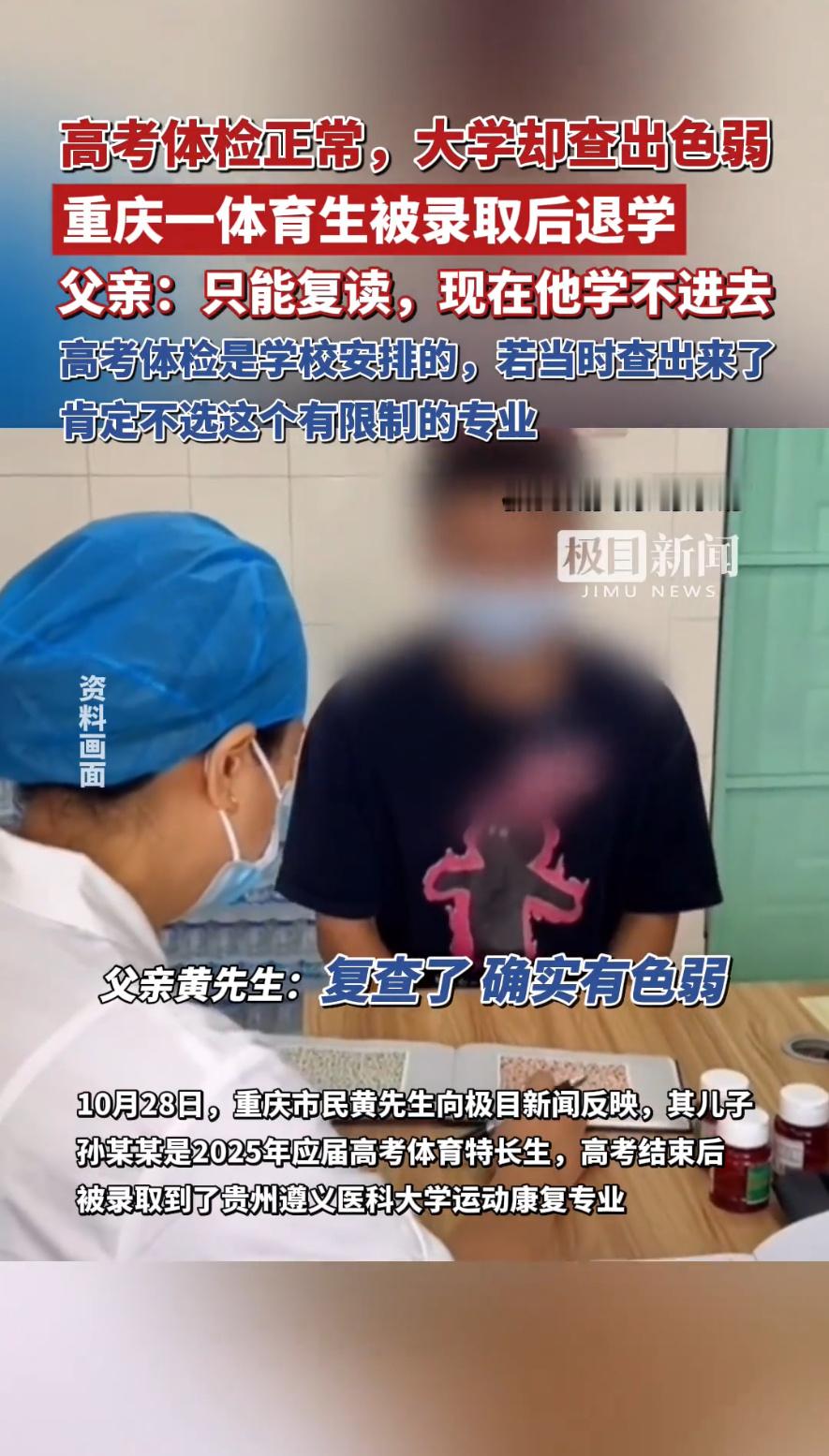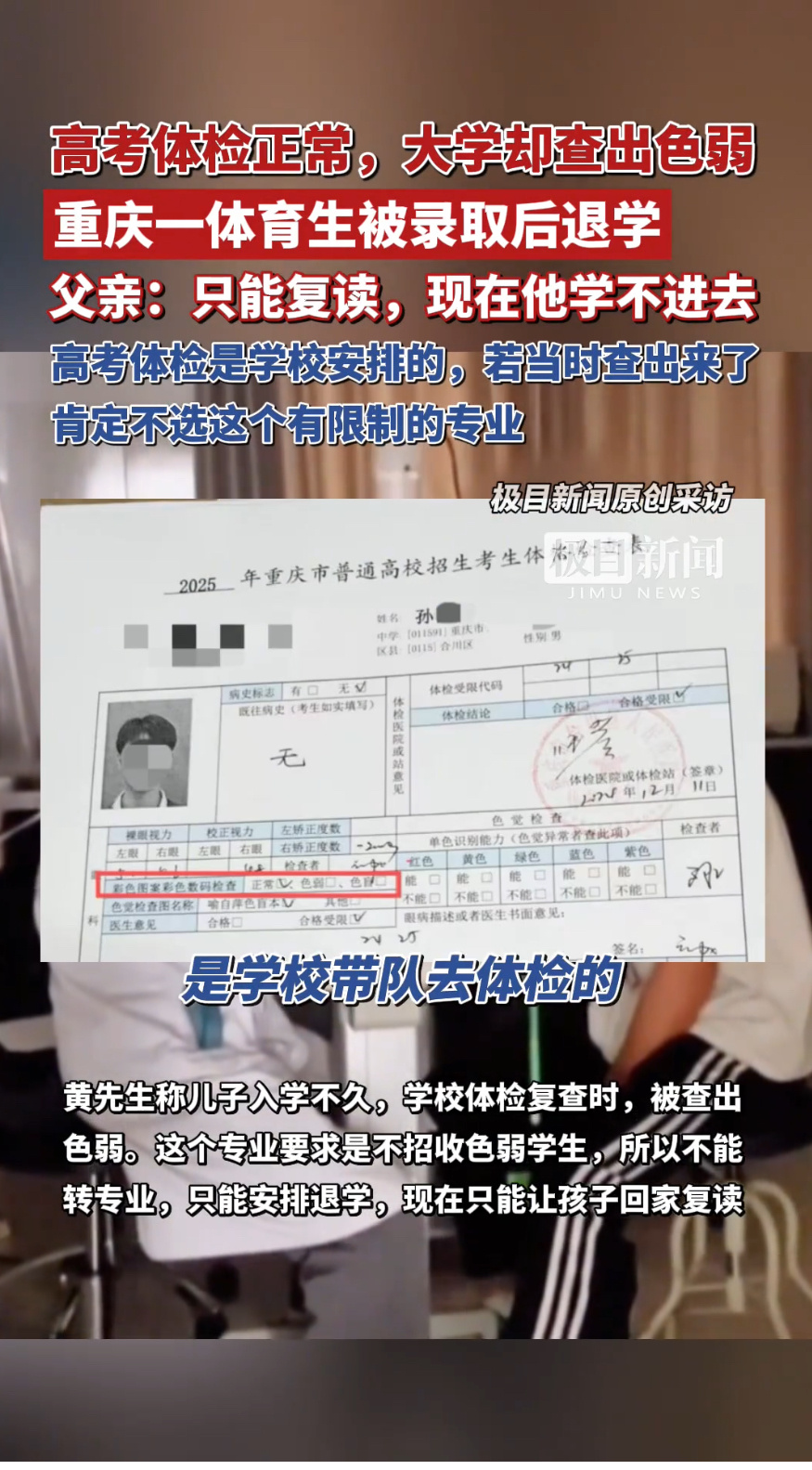 高考体检正常大学查出色弱遭退学重庆体育特长生孙某某2025年高考体检显示“色觉正常”,被遵义医科大学运动康复专业录取后,入学复查确诊色弱,因专业明确限制且无法转专业遭退学,多家医院复检印证色弱。事件暴露三方问题:地方体检或存操作不规范,高校执行政策“一刀切”未设补救通道,考生及家长未提前自费做专项检测。最终考生无奈复读,凸显体检标准、报考指导及高校弹性机制的完善需求。