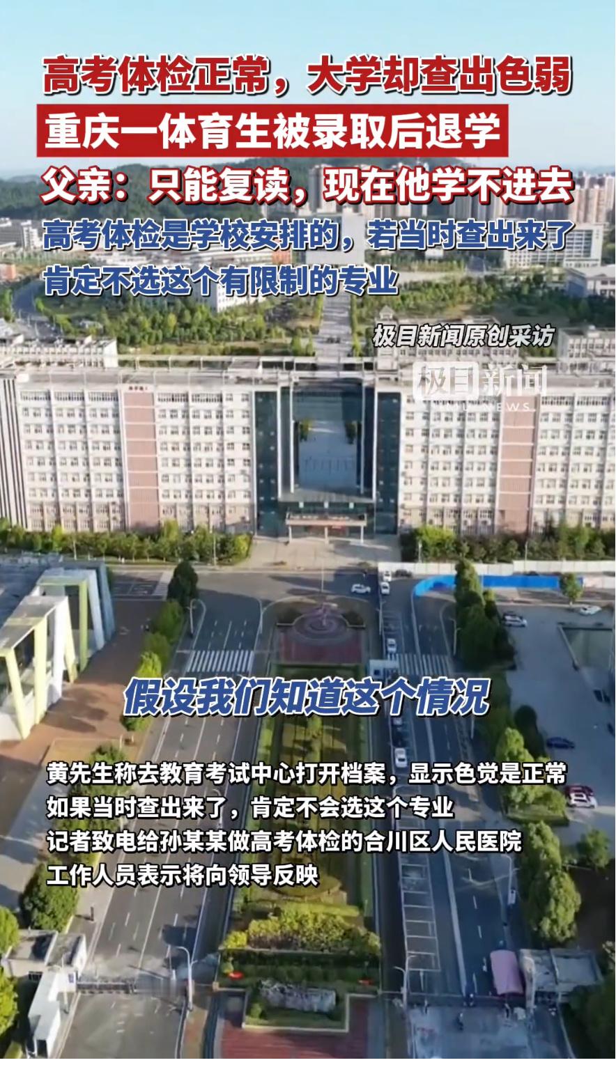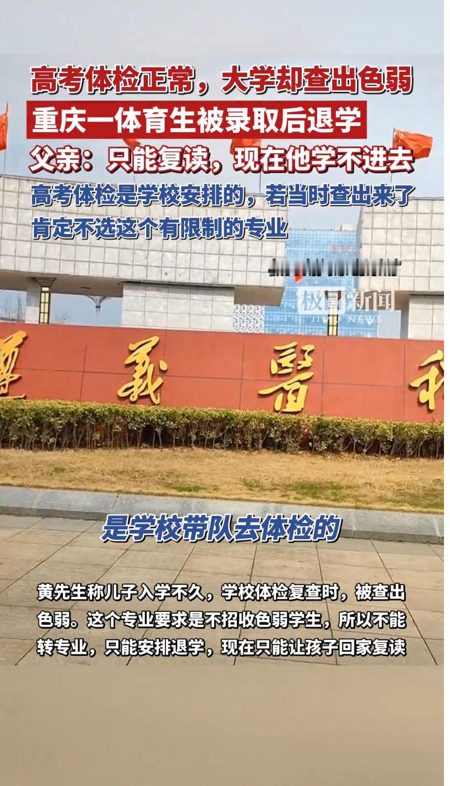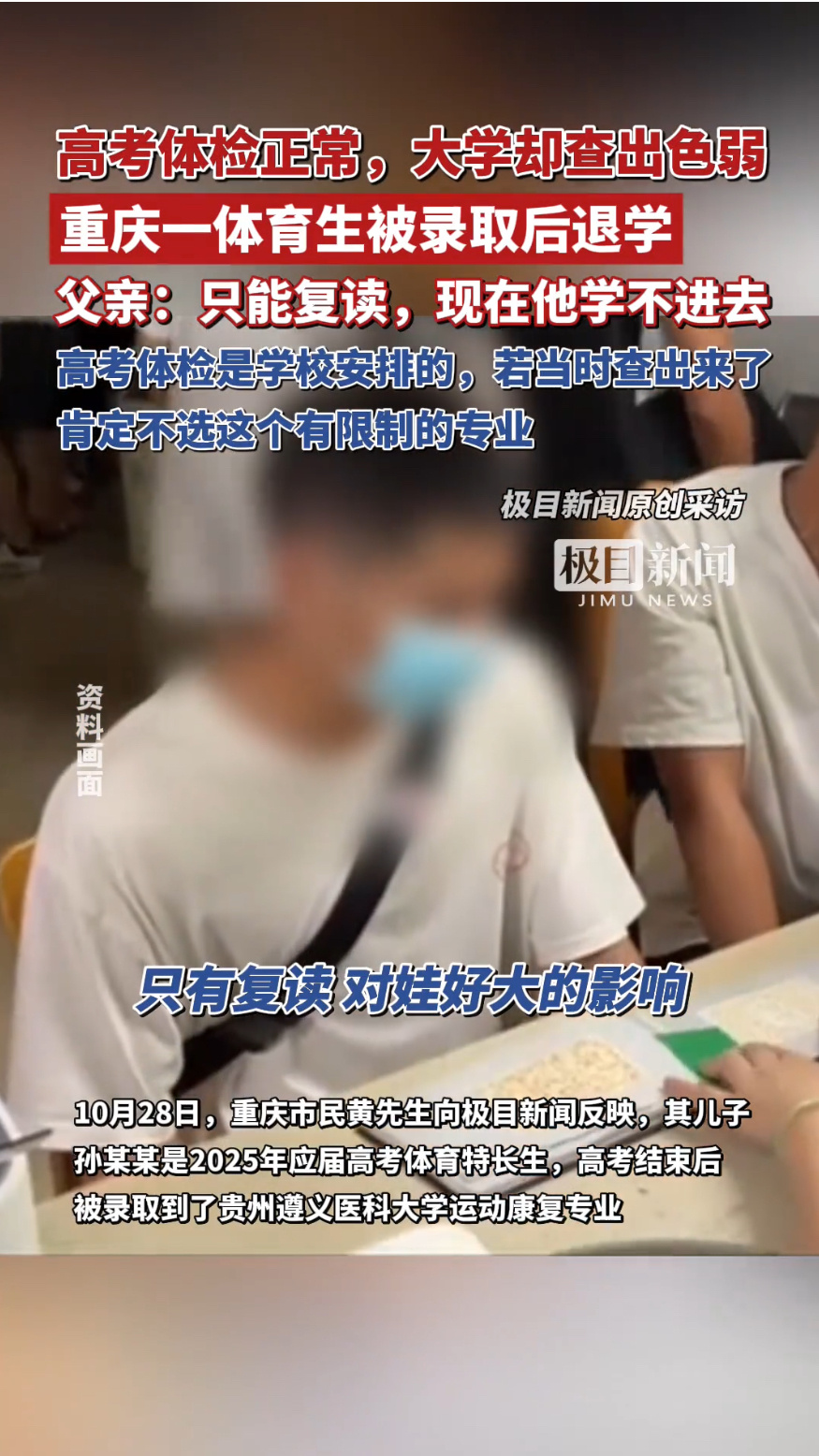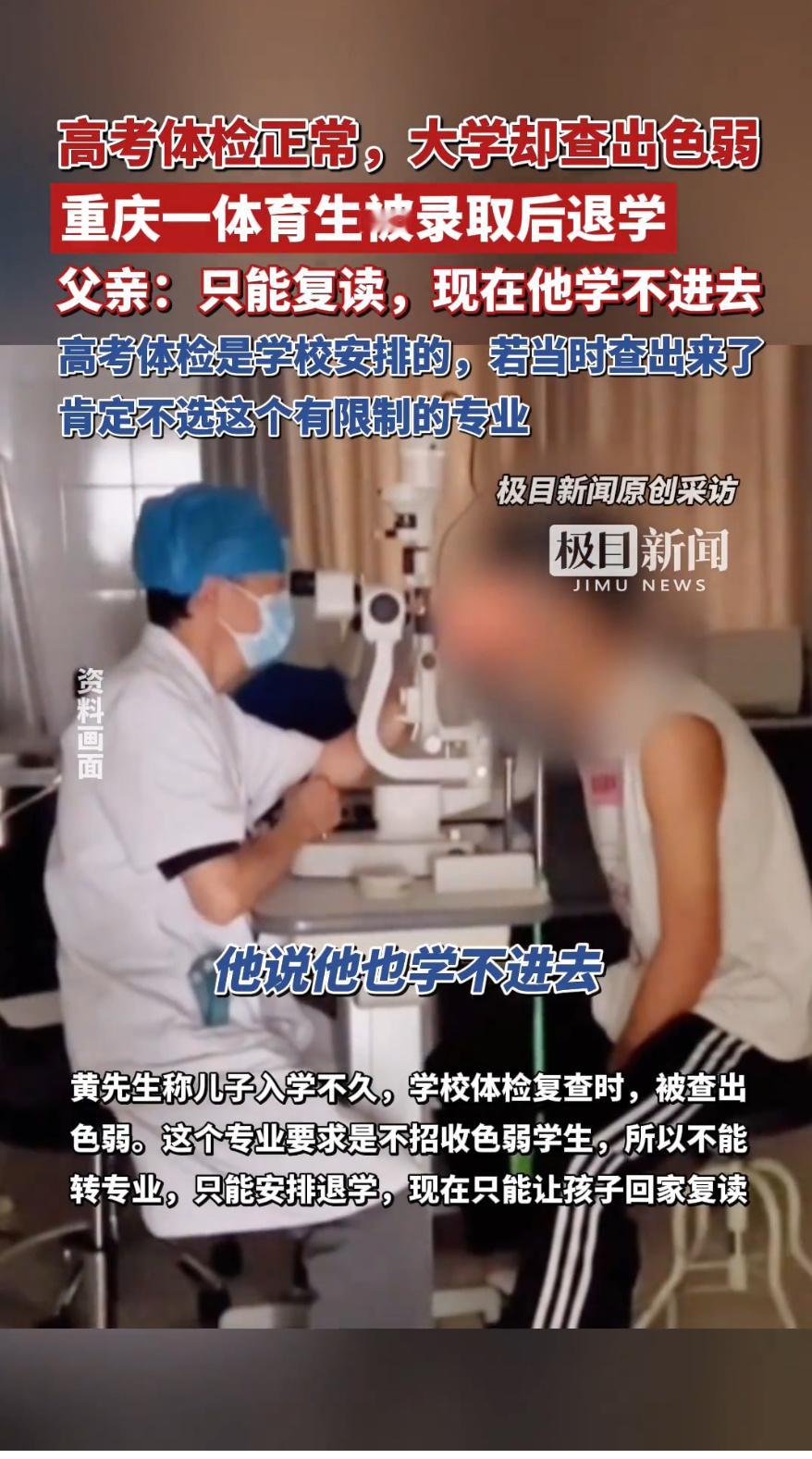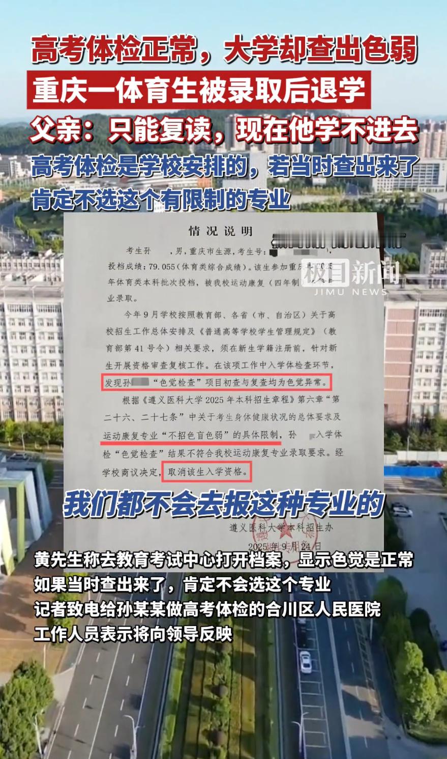 高考体检正常大学查出色弱遭退学重庆体育特长生孙某某2025年高考体检显示“色觉正常”,被遵义医科大学运动康复专业录取后,入学复查确诊色弱,因专业明确限制且无法转专业遭退学,多家医院复检印证色弱。事件暴露三方问题:地方体检或存操作不规范,高校执行政策“一刀切”未设补救通道,考生及家长未提前自费做专项检测。最终考生无奈复读,凸显体检标准、报考指导及高校弹性机制的完善需求。