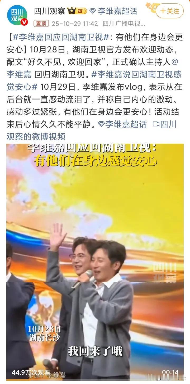 李维嘉,感动发文! 10月29日,“李维嘉回应回湖南卫视”冲上热搜,10月28