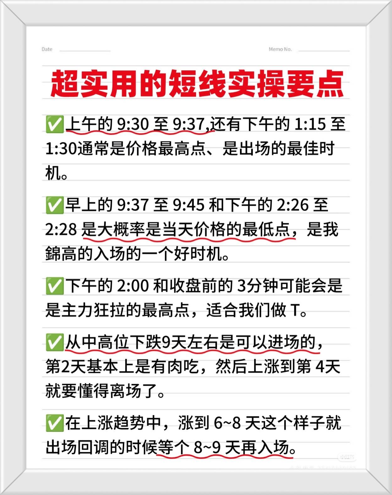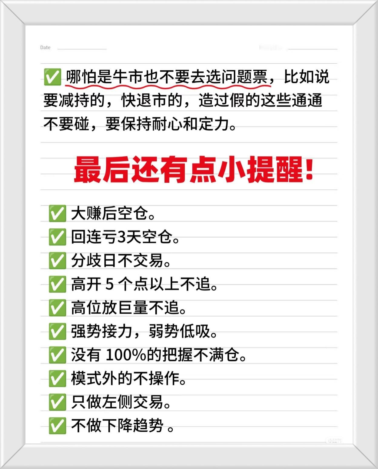 炒股核心知识与实战铁律总结 收藏研究学习!!! 一、基础规律与信号识别 1. 分时走势信号 - 吸筹/出货信号: - 早间低开下午大涨→吸筹;早间高开下午大跌→出货。 - 上午拉高下午回落→洗盘;高位小涨小跌突然放量长阴→出货。 - 量价关系: - 缩量上涨会涨,缩量下跌会跌;放量滞涨→顶部信号;缩量不跌→底部信号。 - 巨量急涨必然回调;低位横盘再放量→上涨概率大。 2. 趋势与主力行为 - 主力动向:尾盘突然拉升可能是为次日出货铺垫;早盘急跌或为主力洗盘(趋势未破则反弹机会大)。 - 趋势原则:只做上升趋势,不碰下跌趋势(顺水行舟 vs 逆水挣扎)。 二、关键操作策略 1. 买卖时机(短线实操要点) - 出场时机:上午9:30-9:37、下午1:15-1:30(通常为价格高点)。 - 入场时机:上午9:37-9:45、下午2:26-2:28(大概率是当日低点)。 - 做T时机:下午2:00及收盘前3分钟(主力可能拉升最高点)。 - 周期规律: - 中高位下跌9天后可进场,次日获利,上涨第4天离场; - 上涨趋势中涨至6-8天出场,回调8-9天后重新入场。 2. 特殊形态机会 - 底部放量涨停:可能是大行情起点(沉睡的狮子苏醒)。 - 均线多头排列:多方力量强,大胆进场(大军压境形态)。 三、风险规避与纪律 1. 必须远离的股票: - 即使牛市也要避开问题股(减持、退市、财务造假等),保持耐心和定力。 2. 十大操作纪律(小提醒!) - 仓位管理:大赚后空仓;连续亏损3天强制空仓;无100%把握不满仓。 - 交易策略: - 股价高开5%以上不追;高位放巨量不追;优先强势股接力,弱势股低吸。 - 只做左侧交易(低位买入),不参与下降趋势的股票。 - 市场环境:市场分歧日(多空激烈博弈时)不交易。 - 模式专注:只操作自己熟悉的模式,拒绝模式外机会。 四、核心口诀速记 - 量价口诀:缩量涨→继续涨,缩量跌→继续跌;放量滞涨→跑,缩量不跌→等。 - 趋势口诀:上升趋势顺水推舟,下跌趋势逆水行舟。 - 操作口诀:高位不贪(气球理论)、急跌不慌(洗盘可能)、题材为王(风口猪飞)。 总结建议 1. 优先关注信号:量价关系(放量/缩量)、分时走势(早盘/尾盘异动)、周期规律(下跌9天/上涨6-8天)。 2. 严格纪律:止损止盈果断,避免情绪化交易(如高开追涨、亏损硬扛)。 3. 长期生存关键:只做确定性机会(上升趋势、主力介入明显),避开高风险标的(问题股、下降趋势)。 按此体系执行,可显著提升散户在复杂市场中的生存与盈利概率! 📈