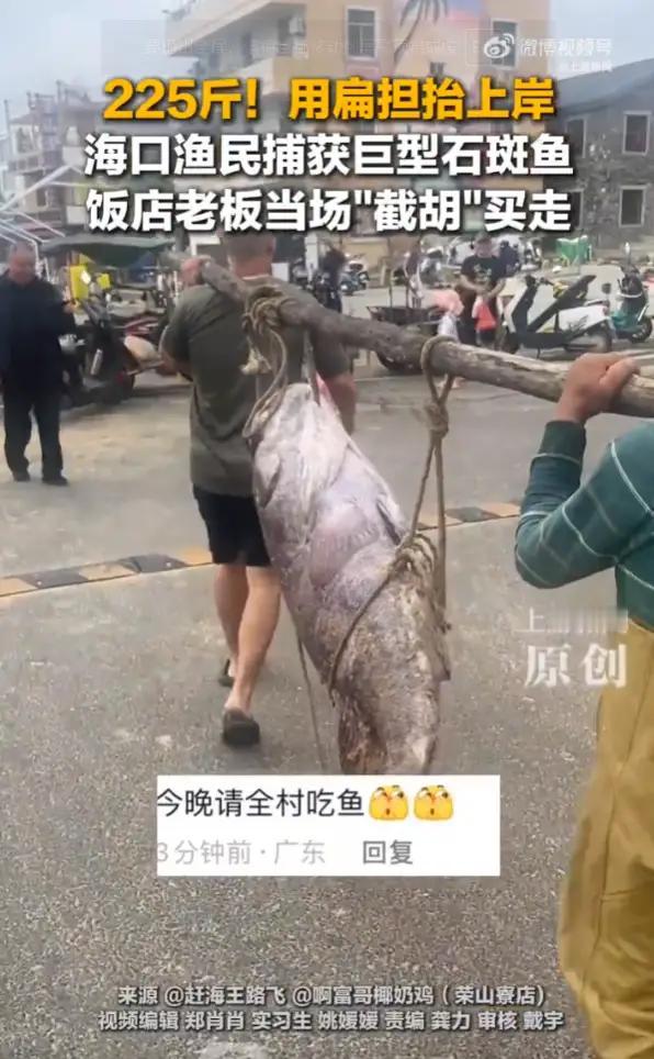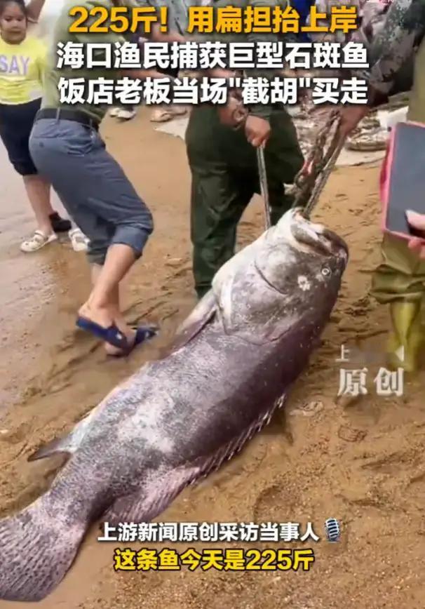 海南海口惊现225斤“龙趸王”!两壮汉扁担抬鱼震撼全场,上岸秒售1.4万!老渔民
