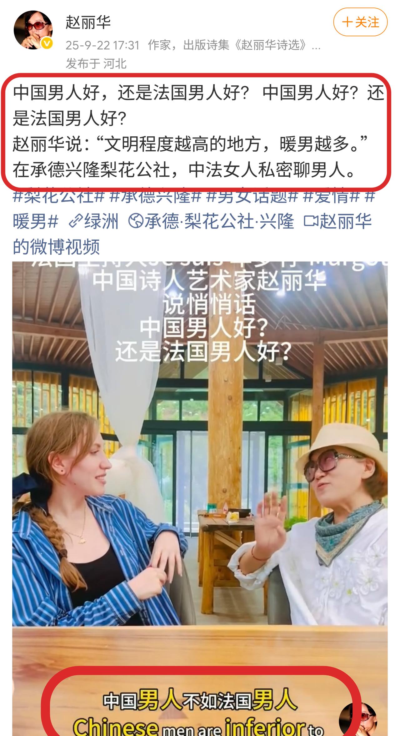 "国内男人比不上法国男人"[笑哭]!女作家赵丽华又发"逆天言论"了。她最近发文讲国内的男人,不像法国男人浪漫又绅士,长得也没人家帅,还把这种区别和“文明程度”关联[奸笑]。 可看法国女人的采访,却和她讲的不一样。人家说现在年轻的法国男人,不会主动帮女士拎包,所谓的绅士风度,只有老辈人身上才有。赵丽华这套说法,现在骗不了人了[6]! 说来有点讽刺,法国男人确实会搞浪漫,咖啡馆里说亲就亲,搞个烛光晚餐很容易。可说到婚姻的责任,不少法国男人就躲得远远的[笑哭]。 再来看我们国内男人,虽不会说甜言蜜语,可婚后就把工资卡交了,努力挣钱养家,比所谓的浪漫靠谱多了[赞]!你对她说的话咋看呢?
