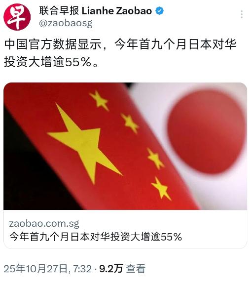 新加坡联合早报10月27日报道:“中国官方数据显示,今年前九个月日本对华投资大增逾55%。”   要知道日本企业对投资向来谨慎,尤其是海外布局,往往会反复测算市场风险、成本优势和供应链稳定性,不会轻易大手笔加码。   这次前九个月突然拿出超55%的投资增幅,肯定不是一时头脑发热,而是冲着中国市场实实在在的吸引力来的。   先看中国市场本身,今年前九个月国内消费市场恢复势头很明显,不管是新能源汽车、智能家居这些新兴领域,还是高端制造、电子元件等传统强项,需求都在稳步上升。   日本企业擅长的汽车零部件、精密仪器、电子材料等领域,正好能跟中国当下的产业需求对上,比如中国新能源汽车产业爆发,需要大量高质量的电池材料、车载芯片配套,日本在这些领域的技术积累刚好能派上用场,投资建厂既能靠近下游客户,又能降低物流成本,这笔账怎么算都划算。   而且中国这两年一直在优化营商环境,不管是知识产权保护力度,还是外资企业准入门槛,都在朝着更开放、更公平的方向调整。   就拿制造业来说,之前部分高端领域对外资还有些限制,现在基本都放开了,日本企业能更自由地参与到中国产业链的中高端环节,不用再像以前那样隔着一层。   加上中国各地政府针对外资企业的配套服务也在升级,从土地审批到政策补贴,流程越来越简化,这也让日本企业觉得投资起来更省心。   再说说全球供应链的大背景,这几年因为各种不确定因素,很多跨国企业都在调整供应链策略,不再盯着单一国家,而是想办法“分散布局”,降低风险。   还有能源成本的问题,今年全球能源价格虽然比前两年稳了些,但整体还是处于高位,日本本土能源资源匮乏,发电成本一直不低,而中国在新能源领域的发展很快,不管是风电、光伏的发电成本,还是储能技术的应用,都走在世界前列。   另外,中日之间的区域经济合作也在不断深化,比如RCEP(区域全面经济伙伴关系协定)生效后,中日之间的关税壁垒进一步降低,很多日本产品出口到中国能享受更低的关税,而在中国投资建厂,生产的产品不仅能内销,还能通过中国的外贸渠道出口到其他RCEP成员国,享受更多关税优惠。   可能有人会问,之前不是有传言说部分日本企业要“撤离中国”吗?其实仔细看就会发现,所谓的“撤离”大多是把一些劳动密集型、低附加值的产能转移到东南亚,而像高端制造、研发中心这些核心环节,不仅没撤离,反而在往中国集中。   从具体行业来看,今年前九个月日本对华投资增长最明显的是高端制造和新能源领域。比如在汽车零部件行业,日本的电装、爱信等企业,都在中国新建了生产线,专门为中国的新能源汽车厂商配套;在电子材料领域,日本的信越化学、住友化学,也加大了在中国的产能,生产用于半导体、显示屏的高端材料。这些投资不是小打小闹,很多项目的投资额都在亿元以上,而且都是长期布局,不是短期投机。   还有一点不能忽视,就是中国的人才优势。中国每年培养的理工科毕业生数量庞大,而且素质越来越高,不管是研发人员还是技术工人,都能满足日本企业的需求。   相比之下,日本本土面临劳动力短缺的问题,尤其是高端制造业的技术工人和工程师,缺口越来越大,而中国不仅能提供充足的人才,人力成本相对日本也更有优势。比如日本企业在中国设立研发中心,招聘一名工程师的成本,可能比在日本低一半,而且还能招到熟悉中国市场的人才,这对企业开拓市场很有帮助。   当然,日本企业对华投资大增,也离不开中日两国政府的推动。今年以来,中日两国在经贸领域的交流越来越频繁,从高层互访到企业对接,都在为双方的投资合作创造更好的条件。   比如上半年中日举行的经贸磋商,就针对外资企业在华经营的一些痛点问题达成了共识,进一步消除了合作障碍。政府层面的积极互动,也给日本企业吃了一颗定心丸,让他们更敢放心大胆地在中国投资。   不过也要看到,虽然前九个月投资增幅显著,但日本企业对华投资也面临一些挑战,比如市场竞争越来越激烈,中国本土企业在很多领域已经崛起,日本企业不能再像以前那样靠技术优势轻松占领市场,必须拿出更有竞争力的产品和服务。   还有地缘政治的不确定性,也可能会影响日本企业的投资决策,这就需要中日双方继续加强沟通,为企业营造稳定、可预期的合作环境。