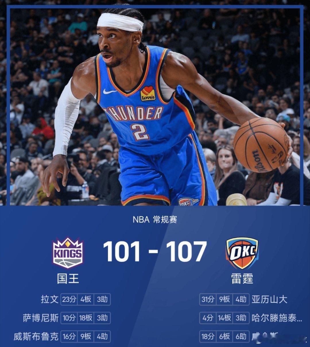 10月29日讯 25/26赛季NBA 常规赛,雷霆对阵国王。双方全场战罢,雷霆107-101战胜国王。亚历山大砍下全场最高的31分9板4助,率领雷霆成功取胜。