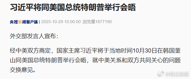 #中美领导人会晤#【#中美元首釜山会晤#】外交部发言人宣布:经中美双方商定,国家主席习近平将于当地时间10月30日在韩国釜山同美国总统特朗普举行会晤,就中美关系和双方共同关心的问题交换意见。 (央视新闻)