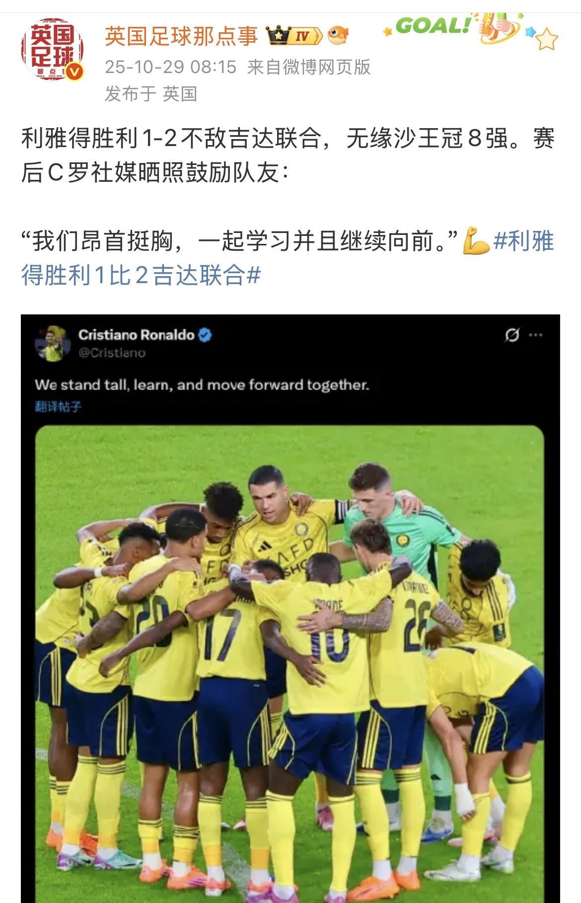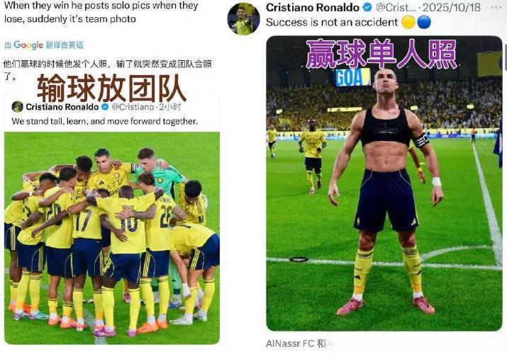 利雅得胜利1-2不敌吉达联合,无缘沙王冠8强。赛后C罗在社媒晒出他和队友们的照片:“我们昂首挺胸,一起学习并且继续向前。” 众人笑翻了:赢球晒自己照片,输球晒球队照片。 这不是污蔑他。赢球后,C罗粉丝在营销文案里都直言不讳:我罗会单独发社媒庆祝,一些可爱的仪式感。