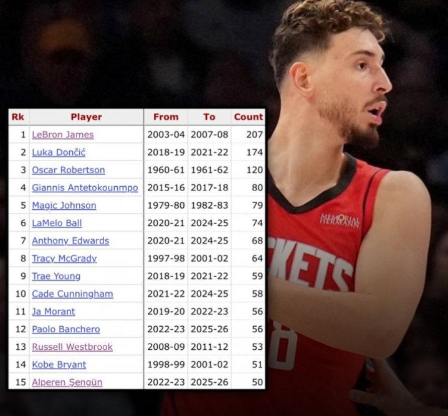 这是申京生涯第50次20+5+5,根据数据统计,他是NBA历史上完成50次20+5+5最年轻的球员,也是最年轻的中锋。