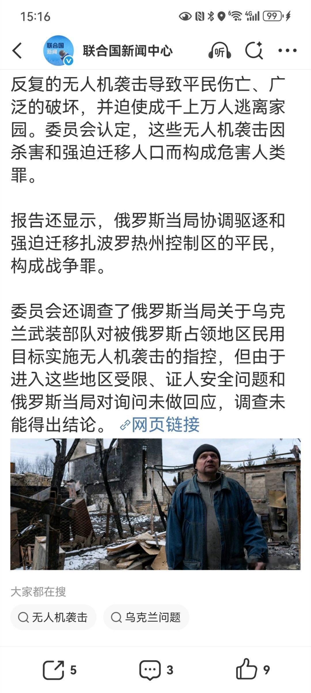 联合国认定俄构成危害人类罪与战争罪【独立国际调查委员会:俄罗斯无人机袭击与驱逐平民构成危害人类罪与战争罪】危害人类罪与战争罪联合国乌克兰问题独立国际调查委员会最新报告认定,俄罗斯通过系统性无人机袭击与强制迁移平民,构成危害人类罪与战争罪。其袭击范围沿第聂伯河延伸超300公里,造成大量平民伤亡和流离失所。