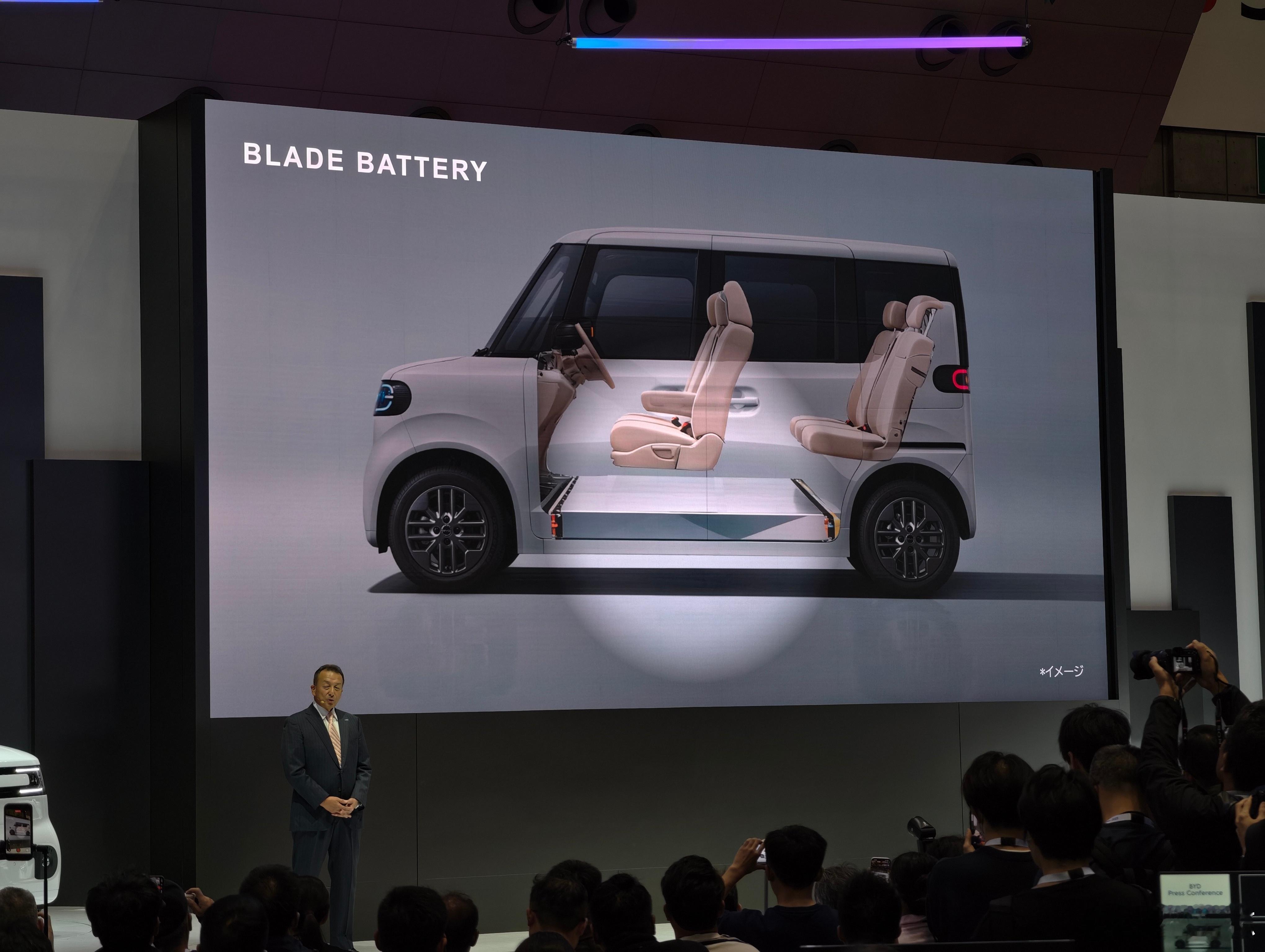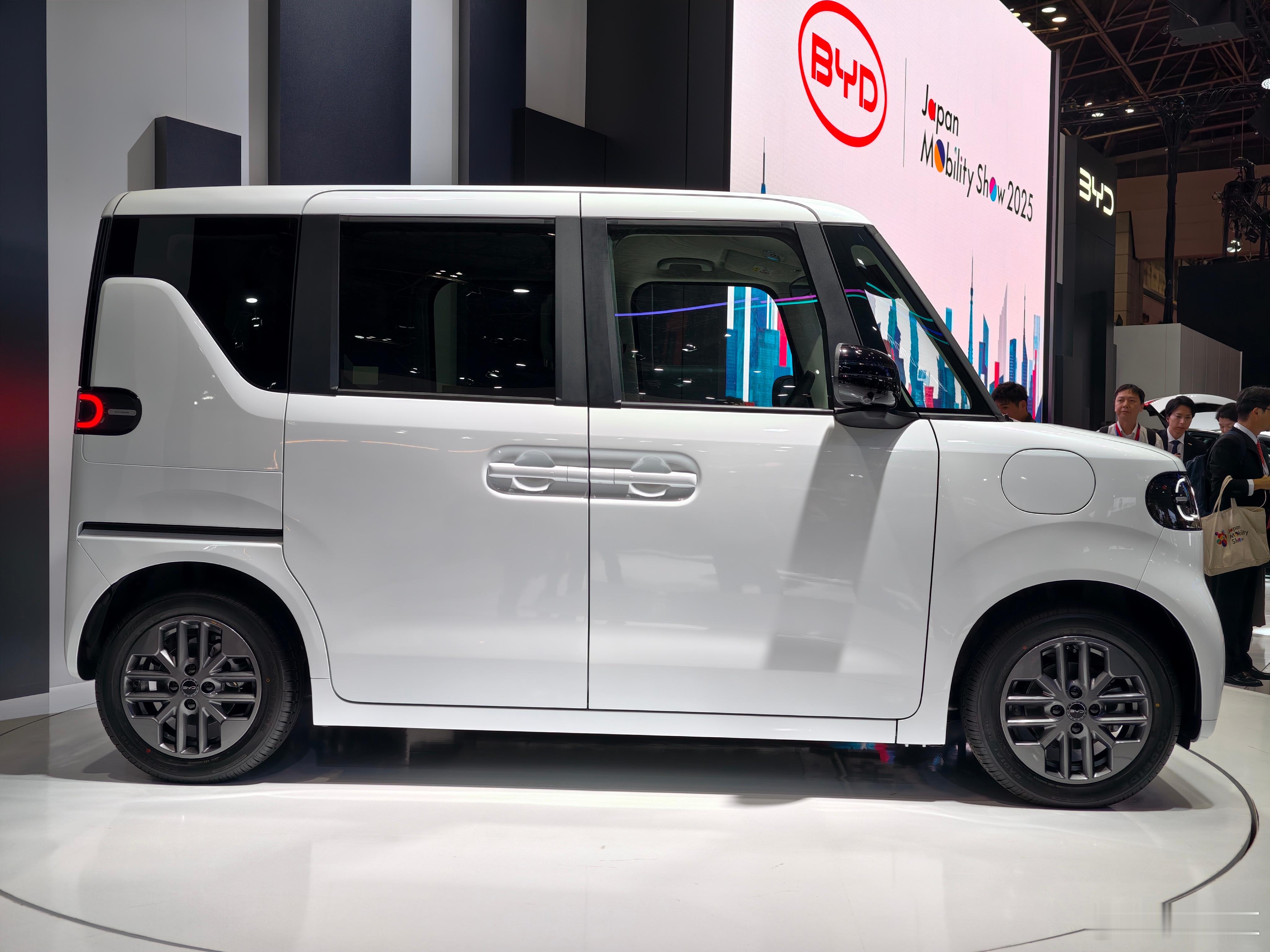 2025东京车展 传说中的比亚迪电动小K终于来了。BYD RACCO(比亚迪海獭),纯电动 EV, 刀片电池中置,四轮尽量推到四角,短前后悬设计,最大化车内空间。车侧配备双侧滑门,针对日本狭窄街道和停车位提升便利性。