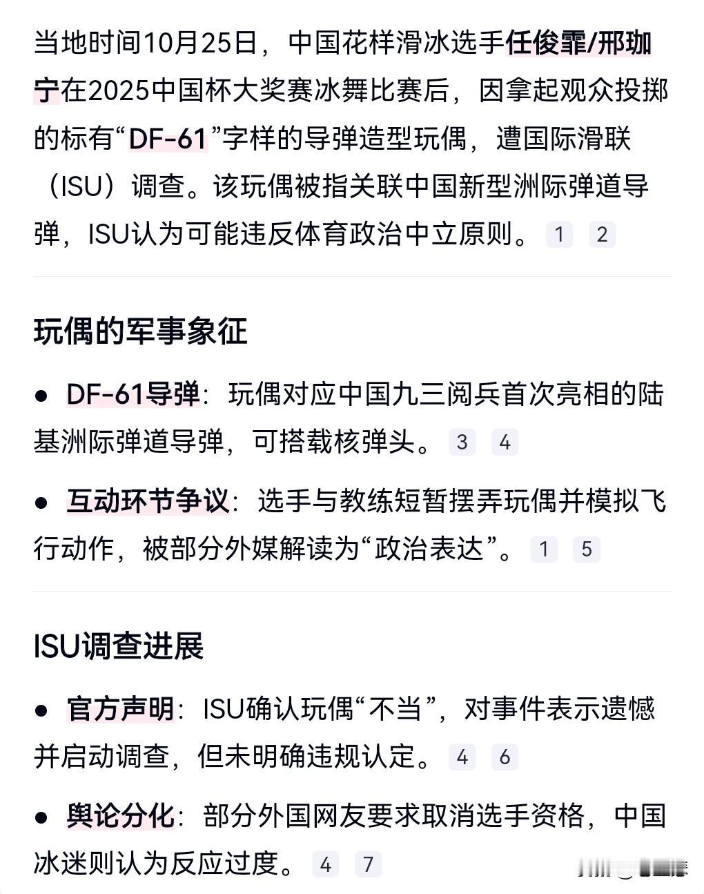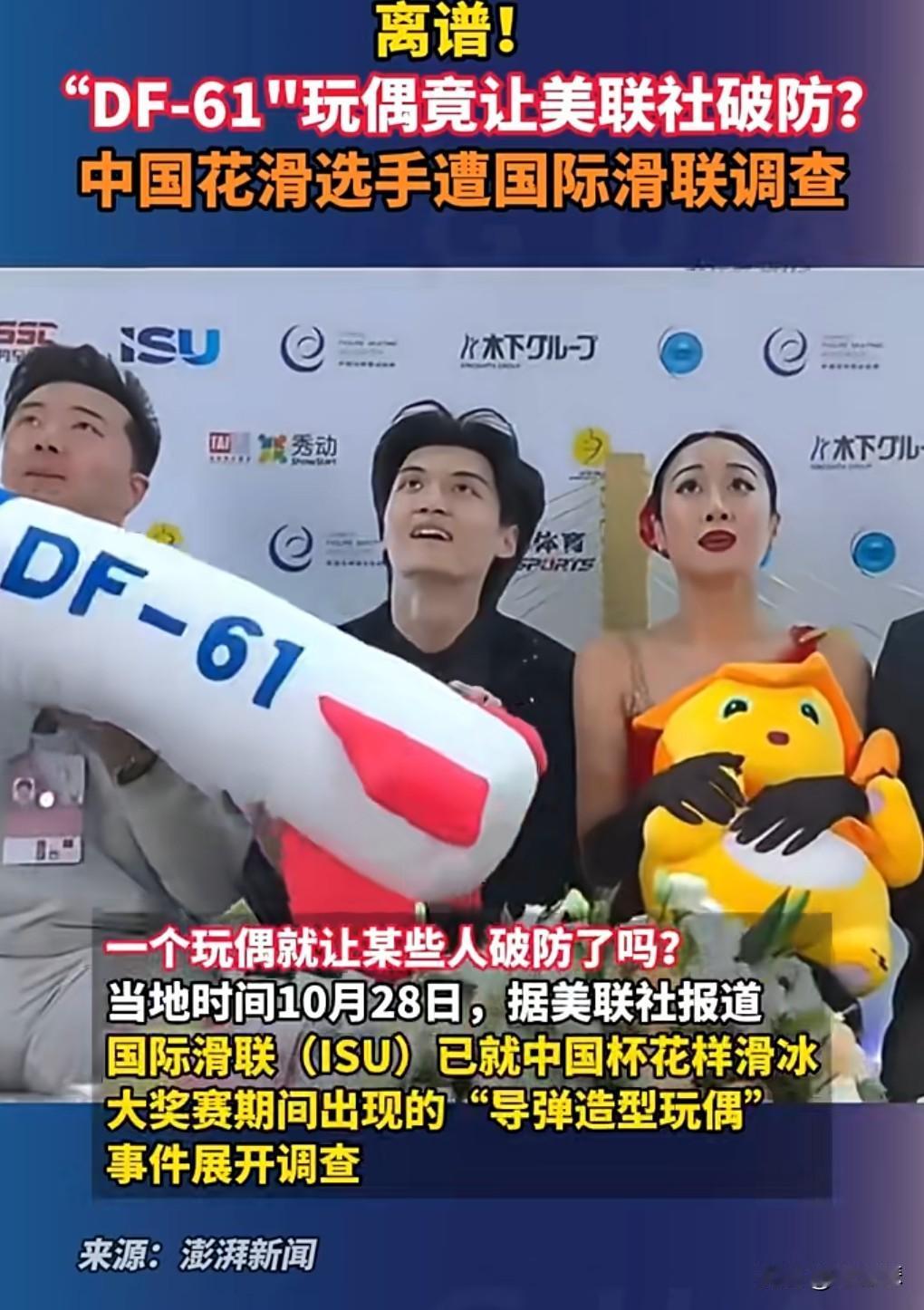 这真的是太荒谬了,这是现实版的欲加之罪何患无辞啊。 近日,中国花滑选手因玩偶遭国际滑联调查。 中国的花滑选手因为摆弄粉丝送的东风61导弹造型的玩偶,没想到要遭到国际滑联的调查。 这真的是太离谱了。 中国花滑选手的行为被认为是有某种政治倾向。 所以要调查。 国际滑联说涉嫌违反体育政治中立原则。 那么我就要问,既然体育不能涉及到政治。 那么请问为什么不让俄罗斯参加国际赛事,这还不是已经是体育和政治挂钩了吗? 所以说这个国际滑联就是在找事情,就是嫉妒中国选手的优秀和中国体育的强大。 如果真的是体育不能和政治挂钩,那么就应该让俄罗斯参加国际赛事。 这样才能服众。