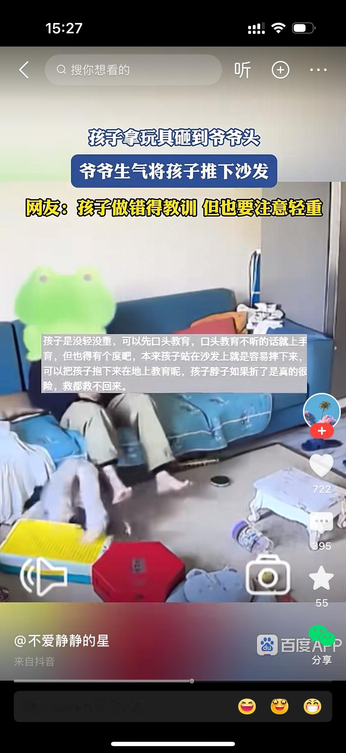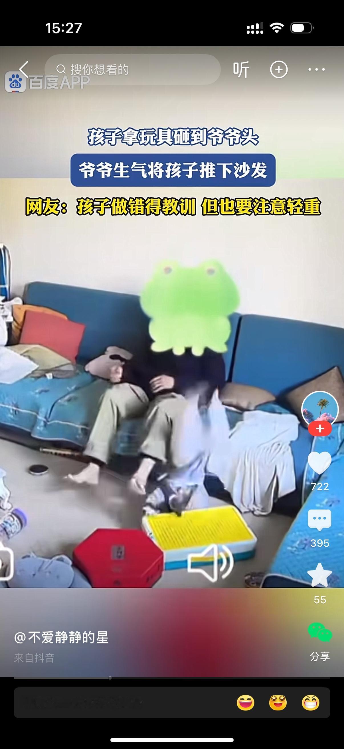 孙子拿玩具砸到爷爷头。爷爷生气将孩子推下沙发,孙子直接从沙发上滚下来,摔了一个大跟头。这个爷爷是真不懂事啊,这样很危险的。一不小心小孩的脖子都有可能断掉。孩子不懂事需要教育,但也要注意轻重。这样的爷爷带娃太危险,孩他妈知道你这样对她的儿子,她还不把你扫地出门啊。