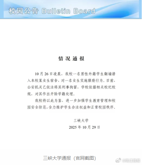 【#三峡大学通报留学生夜闯女寝#:#夜闯女寝留学生已被刑拘#、开除学籍】#警方回应留学生深夜擅闯女寝# 10月29日,三峡大学一名留学生凌晨爬楼进入女生宿舍事件引发网络关注。29日下午,三峡大学发布通报:10月26日凌晨,我校一名男性外籍学生翻墙潜入本校某女生宿舍,对一名女生实施猥亵行为。目前公安机关已依法将其刑事拘留,学校依据相关校纪校规,对其作出开除学籍处理。