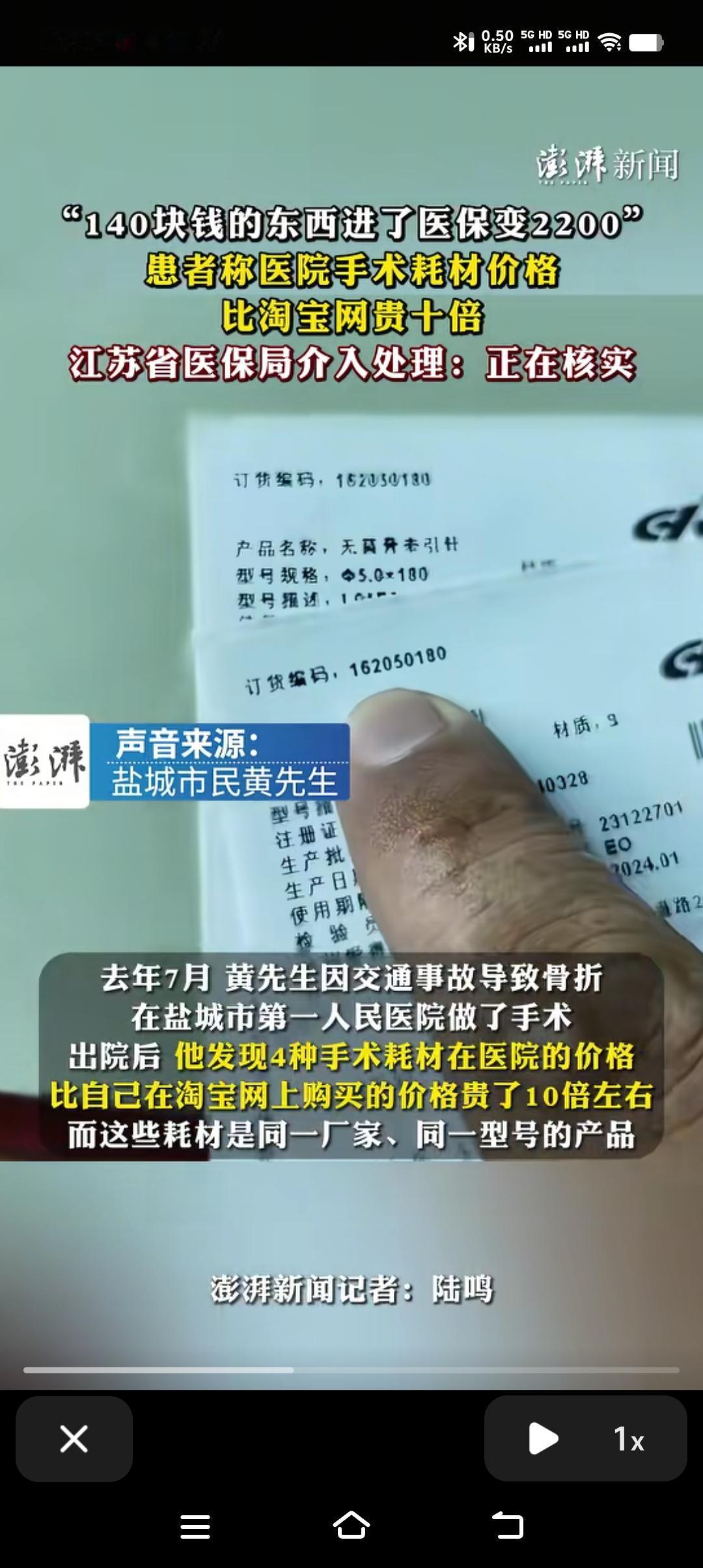 18590元的手术器械费,网上买则需要1800元,厂家、型号、规格、编码等完全相同。一根固定骨折手术的针杆夹,网上卖140,医院卖2200。经患者反映后,院方把价格调到了895。 针对患者提出的疑问,院方给出的答复是。“医疗器器械和耗材是不允许通过网络平台销售和购买的,医院都是在阳光平台采购的,购买渠道不同,所以才导致价格差。而且院方采用的都是0差价,也就是说医保局挂多少钱,院方就收多少钱”。 不过有一点让人想不通的是,既然院方器械耗材采用的0差价,那么为什么在患者反映问题的时候,却又悄悄的把2200元针杆夹的价格改到895元呢?这不是难圆其说吗? 但愿世界人无病,何妨架上药生尘。医院救死扶伤的地方,如今却变成了坑你没商量的地方。