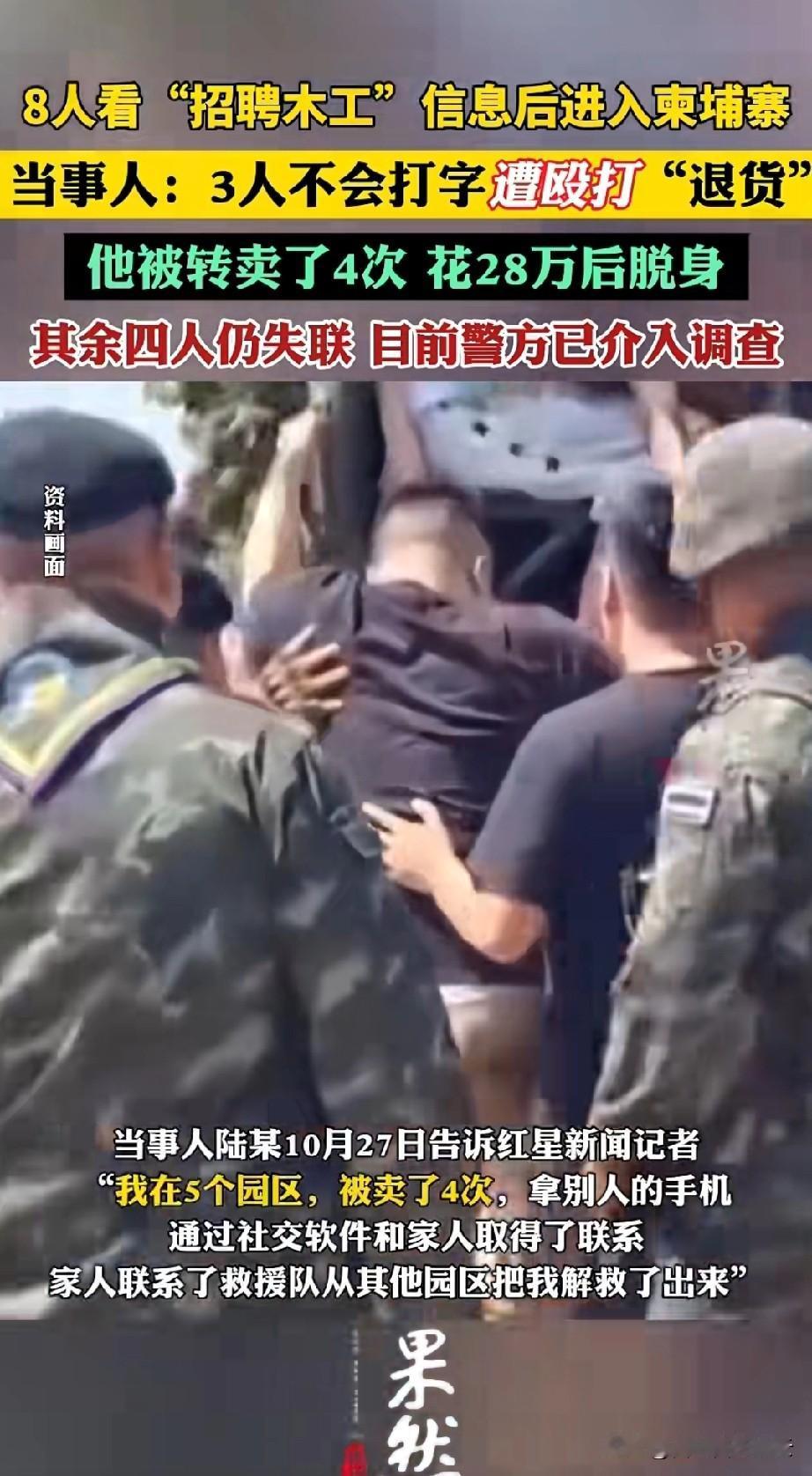 没想到不会打字还能救人一命。 8名经验丰富的川籍木工,看到招聘广告上说,柬埔寨金边酒店那边装修需要招10多名木工,他们中几个人有出国务工的经历,他们商量了一下,就报名去了。 结果一下飞机他们就被没收手机、护照,送去了电诈园区。那里到处是高墙铁网,动不动还被打。 他们8个人中的3个人比较幸运,说起来则心酸,因为不会打字被骗子嫌弃所以逃过一劫。打了一顿后就被送出园区,给了他们手机、护照回国了。 剩下的五个人就惨了,据逃出来的一个人说,他在5个园区待过,被转卖了四次。后来还是用别人的手机和家人取得联系,交了28万赎金后才被放出来。 他说,另外四个人他也不知道他们去了哪里,现在怎么样了。 这几个人都是普普通通的农民工,为了生计出国打工。他们没有贪图高额的工资,他们也没有想着不劳而获,也被骗了。只能说现在的电诈骗子一点底线也没有了,他们把我们中国人当成了摇钱树。什么时候才能把他们一网打尽呢? 我想那个给出28万的大哥,他赚这些钱得需要多长时间啊?还有另外四个人,如果家里人拿不出赎金会怎么样呢? 对于这件事,你怎么看呢?