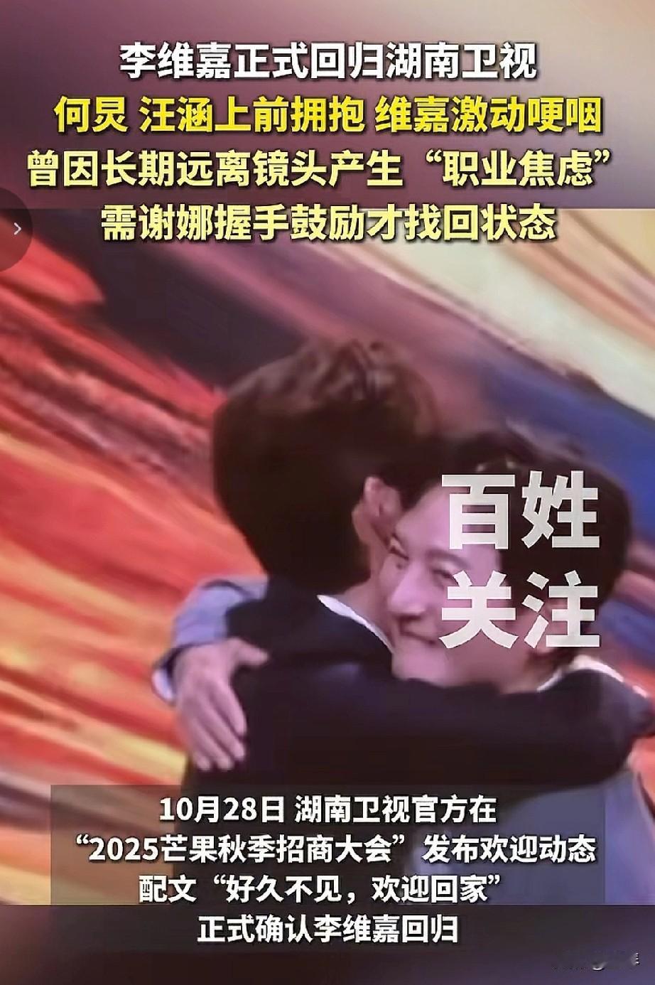 停播4年后,李维嘉重回湖南卫视,与何炅等人热烈相拥! 2025年10月28日,李维嘉首次以湖南卫视主持人身份亮相“2025芒果秋季招商大会”,现场还和何炅、汪涵拥抱互动,直接喊出“我回来了!” 采访中,李维嘉有些激动,说自己长期离镜后,录《萌探3》时紧张到手心冒汗,还是靠谢娜握手鼓励才找回状态的,这次回归现场发言都激动哽咽了。 目前,李维嘉已经确定主持《再见爱人》第五季啦,后续可能还会去《你好星期六》串门,甚至有机会和“快乐家族”老伙计重聚,期待值拉满! 低谷时哪一句话支持你走下来湖南卫视 李维嘉