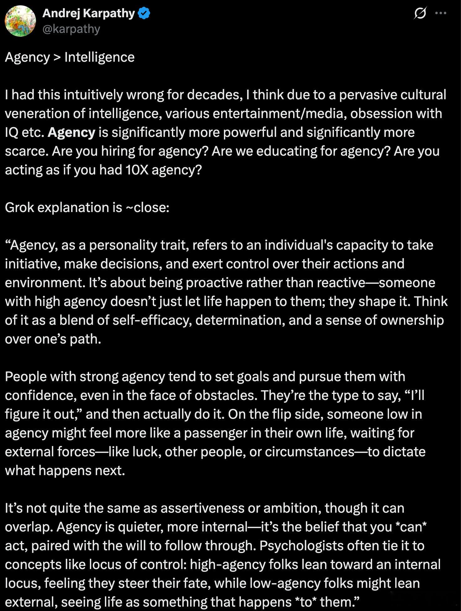 我过去几十年里在这个问题上一直理解错了,这可能源于文化中对“智能”(Intelligence)的普遍崇拜——媒体和娱乐作品的塑造,对IQ的痴迷等等。但其实,Agency(主观能动性)比Intelligence更稀缺,也更有力量。