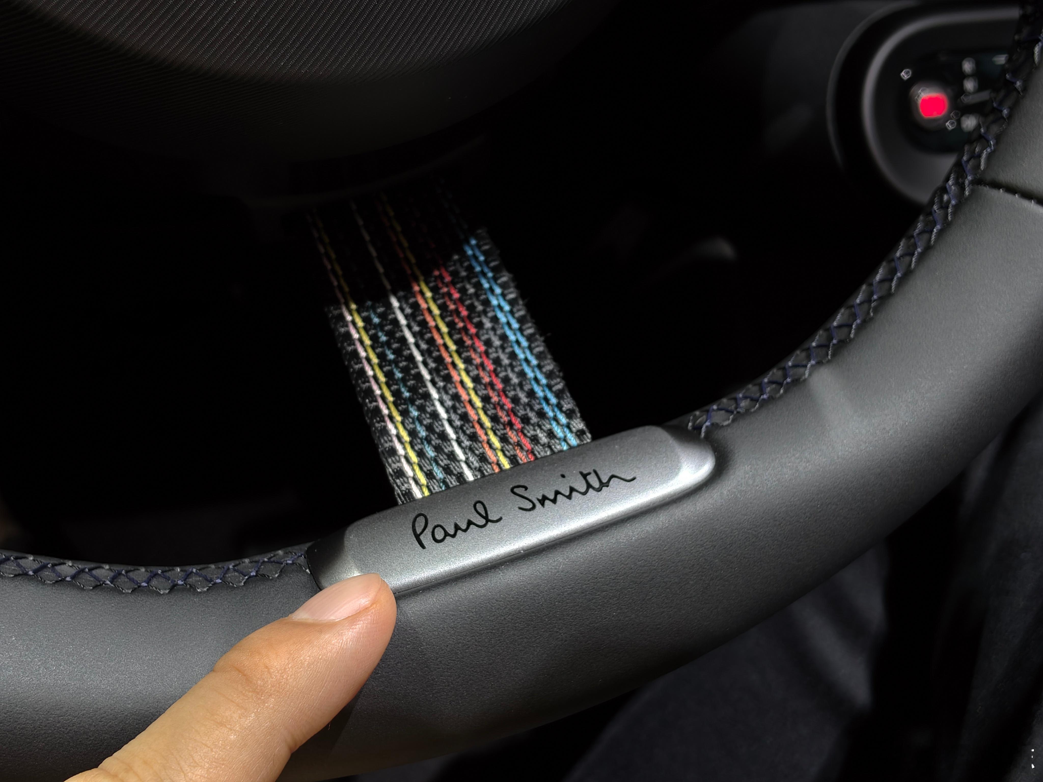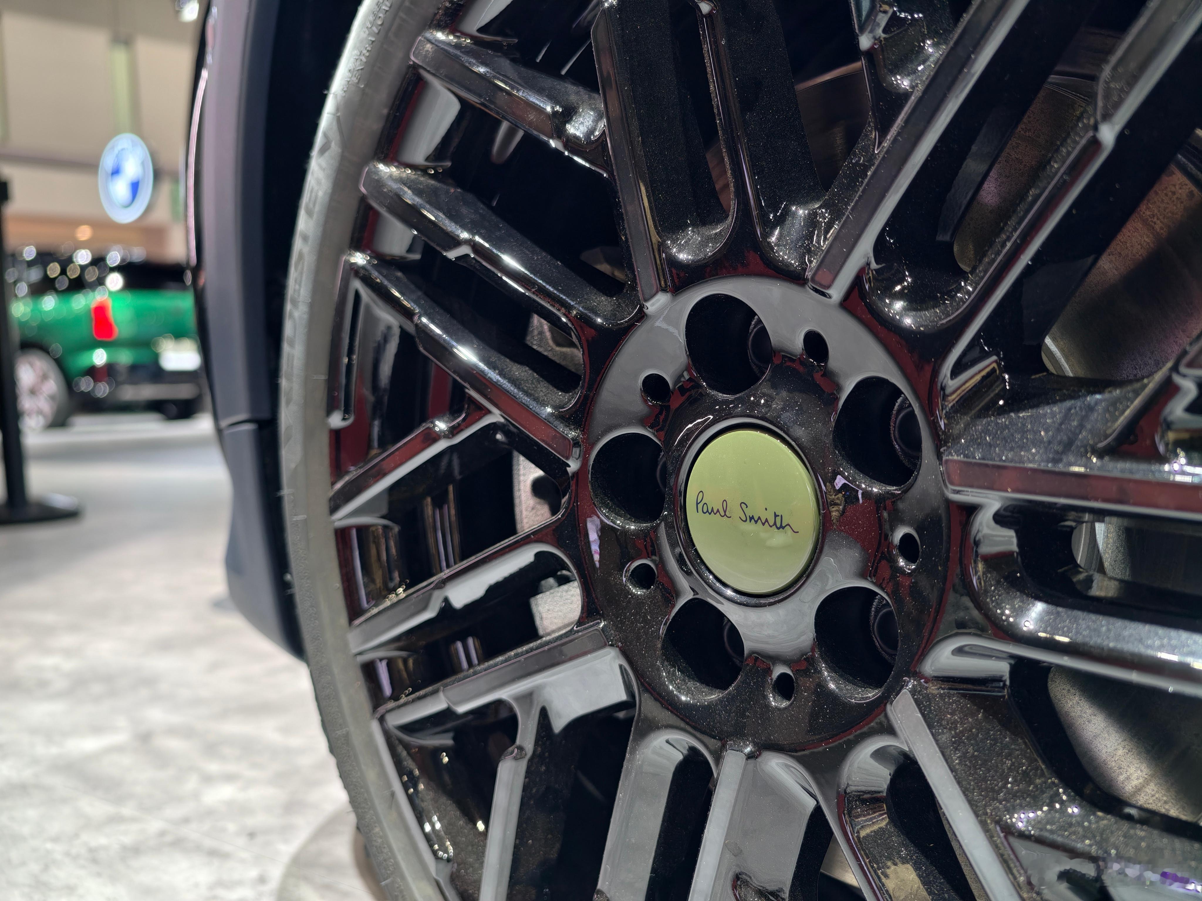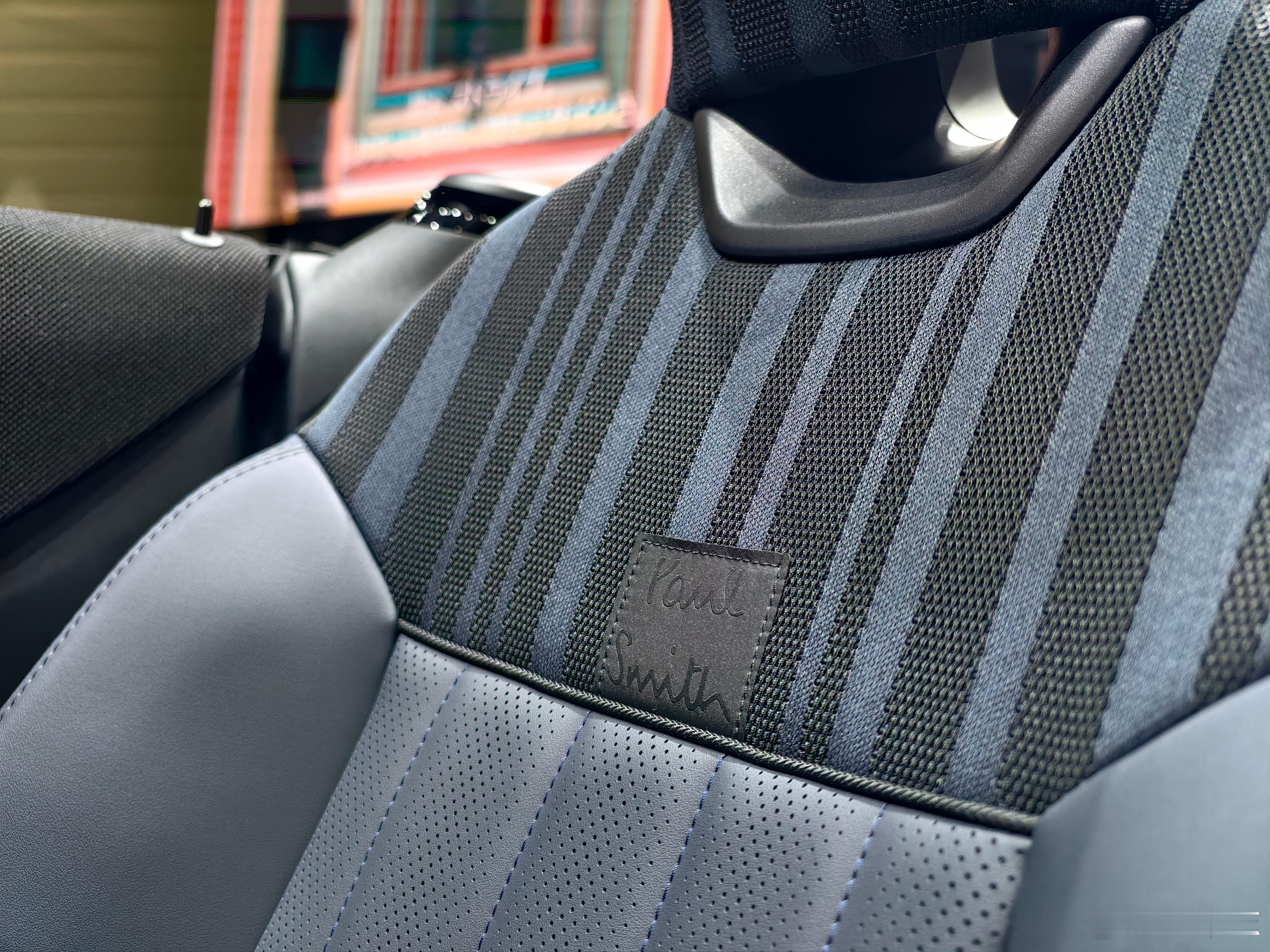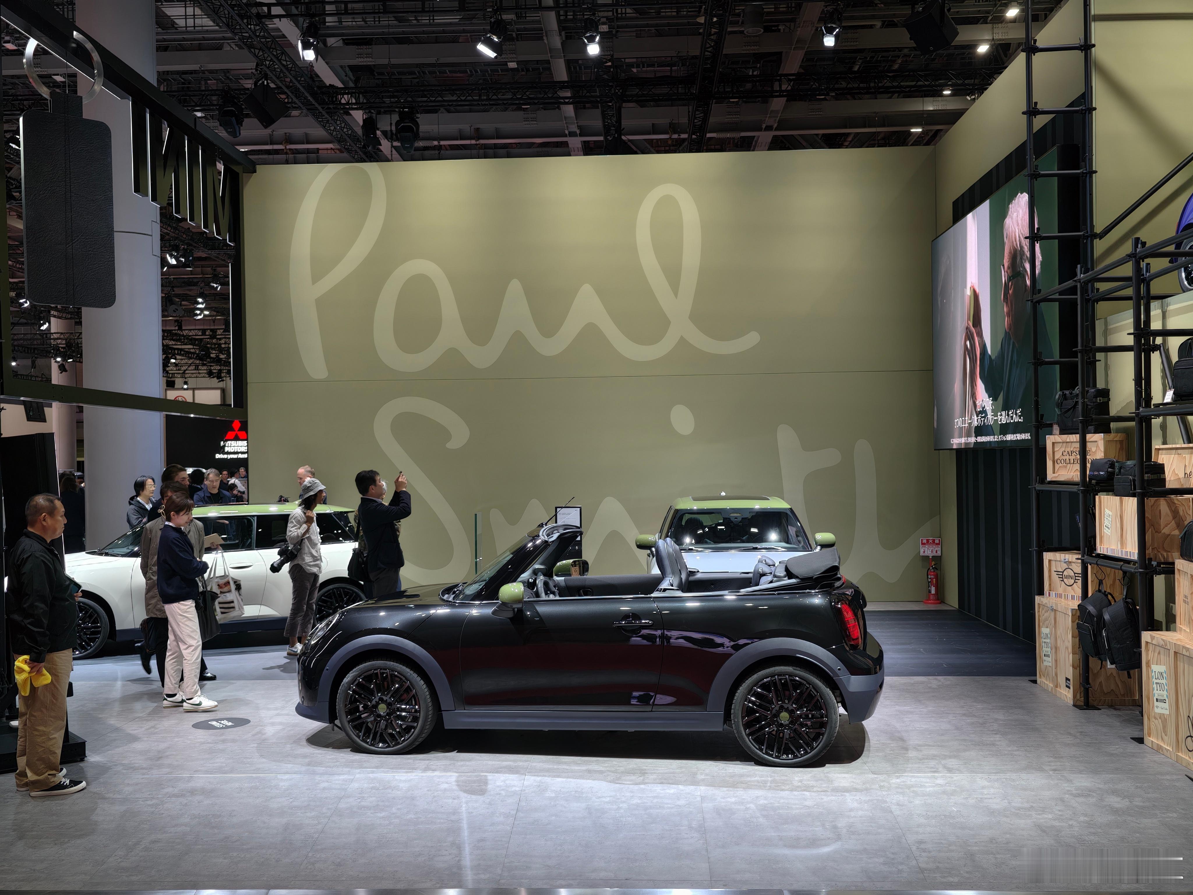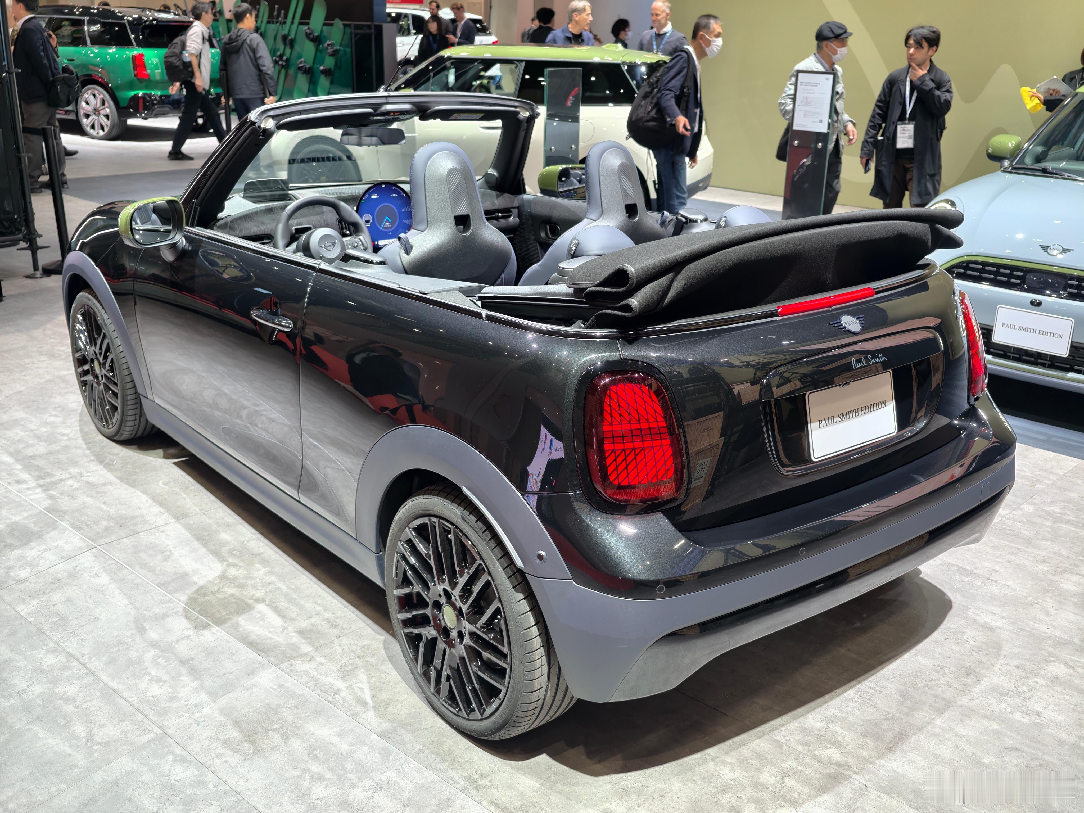 2025东京车展 今年东京车展上最想带回家的,是这台Paul Smith版MINI敞篷。拂晓灰、羊皮纸白、诺丁汉绿,每个颜色都像从伦敦晨雾里走出来。方向盘彩带、Hello投影、地垫上那只小兔子,全是Paul Smith的小心思。表面克制,内心叛逆。