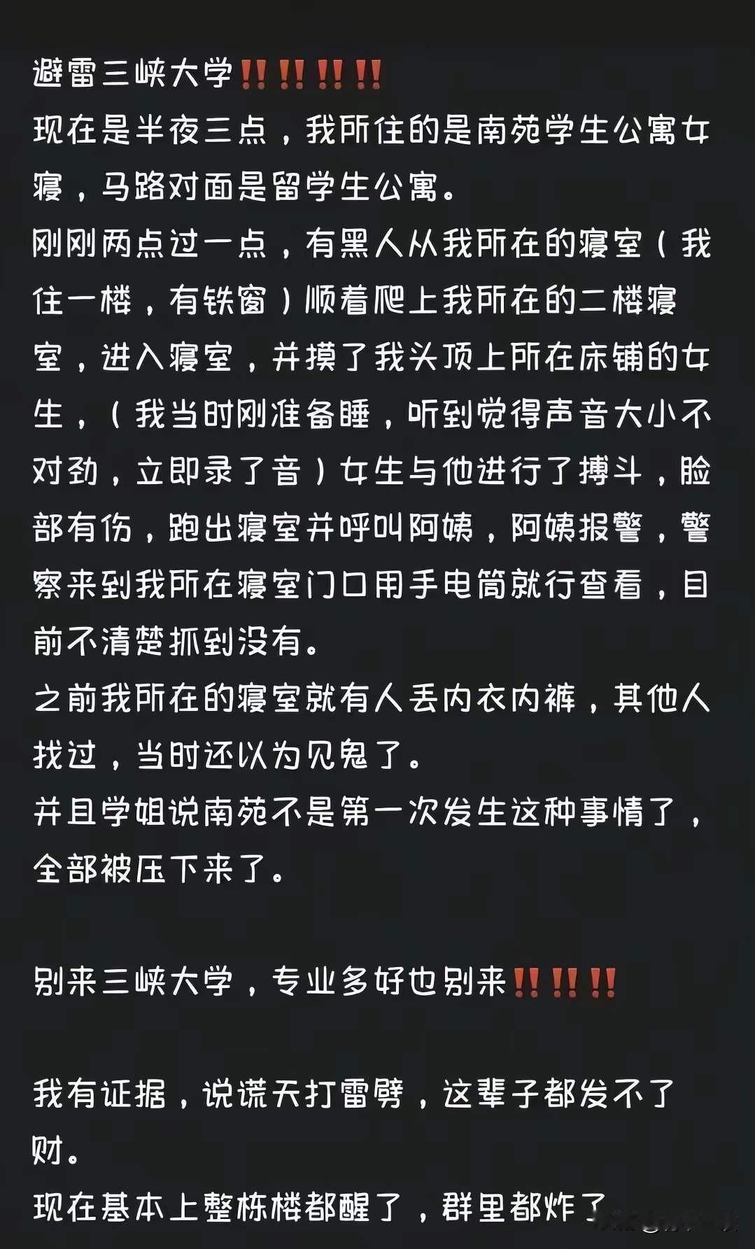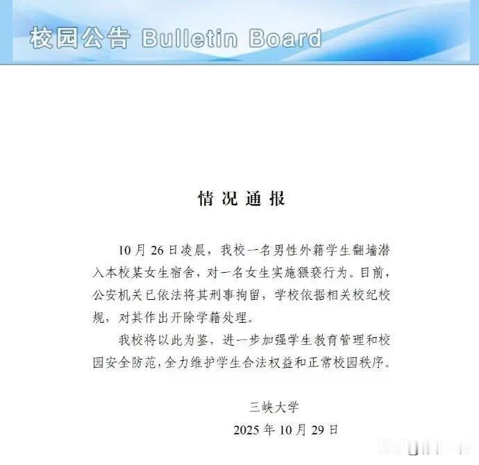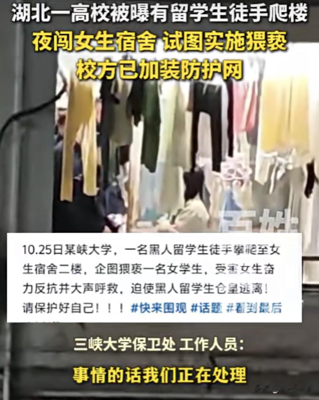三峡大学出事了,一男性外籍学生翻墙潜入女生宿舍,实施猥亵行为,已被刑拘,开除学籍。 更让人心寒的不是歹徒嚣张,是校方的迷之操作。 10月26日凌晨,一名男性外籍学生翻墙潜入女生宿舍,对一名女生实施猥亵行为,直到宿管阿姨报警才仓皇逃窜。 更让人心寒的不是歹徒嚣张,是校方的迷之操作。事发后第一时间不解封安防、不安抚学生,反倒解散宿舍微信群、封死评论区,严禁讨论此事。等舆论炸锅了才在4天后发通报,说涉事者已被刑拘开除,转头就在宿舍外墙装了铁丝网。 这哪是亡羊补牢?要知道这栋宿舍早有前科,女生内衣频繁丢失,本就是明确的安全预警,可校方连二楼防护都懒得装。如今装铁丝网的速度,比处理隐患、回应质疑快多了。 通报里模糊国籍,网传是黑人留学生;有学生爆料留学生住双人公寓拿补贴,本校生挤四六人寝,管理却搞“双重标准”。校方仍拿着保密原则,不愿过多公开细节。涉外就要保密吗?《国际学生管理办法》明明要求一视同仁,到这儿咋就成了“不方便公布”? 现在人抓了、学籍开了,但女生的心理创伤谁管?安防漏洞具体咋补?这些比铁丝网更该给答案。大家觉得,校方是真有难言之隐,还是怕砸了“国际化”的招牌?