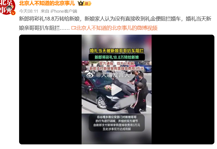 转述【新郎将彩礼18.8万转给新娘,新娘家人认为没有直接收到礼金便阻拦婚车,婚礼当天新娘亲哥哥扒车阻拦】