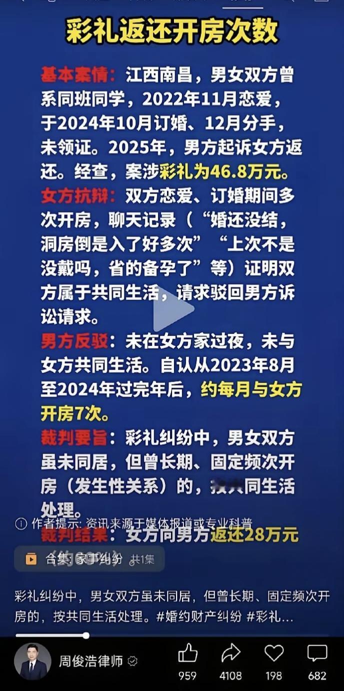 南昌彩礼纠纷案,看了抗辩词,有点小震惊,真可以这么算钱的啊。双方恋爱26个月每月开房7次,算下来共182次。所以彩礼46.8万要返还女方28万,等于说剩下的18.8万就是男方付房费了? 两人是高中同学,22年恋爱,24年订婚同年又闹掰了要分手,但是女方不想退还彩礼。 女方的理由是两人虽然没有结婚,但是洞房都入了好几次,属于共同生活了,这彩礼是她因得的。 但是男方却狡辩表示两人只是开房,有没有同居,从来没有在女方家过夜,女方应该退还彩礼。 我查看了相关法律确实有这种说法,没有领取结婚证,但是双方共同生活。在女方收彩礼的情况下闹掰了,就会根据共同生活的天数来减少彩礼返还金额。 而长期固定、频次的开房也算,认定了对方是以结婚为目的的稳定交流。 看到这确实有点心凉了,之前的深情败给了冰冷的计算,而182次的相处被折算成了万元单价。 可以说就是在一块都的时候感谢多好,在床上不分你我的,但是这闹掰啦,感情都要用钱来计算的。