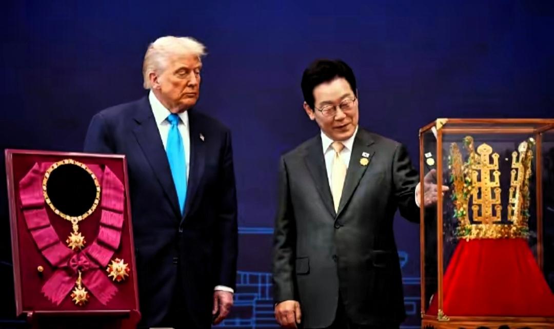 这一次, 李在明直接把特朗普弄得服服帖帖! 如果要数哄人这一块,日本人至少差韩国人好几个段位。 日本人给特朗普送遗物,韩国人明白这根本满足不了特朗普,李在明直接给特朗普送金皇冠大金项链。 老李果然是明白人,活得通透,当初说绝食就绝食说跪就跪,这一次更是把特朗普哄得服服帖帖。 要知道特朗普就喜欢带金这个字,金穹系统,黄金美国,李在明佩戴金色领带不正好与大金皇冠呼应上了! 这一次一向见多识广的特朗普也被震撼到了,看表情,他还有些不适应。