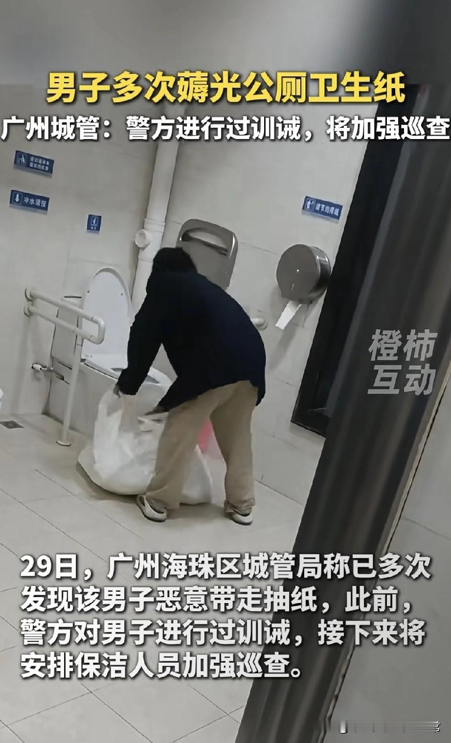 广州一男子把公厕卫生纸薅羊毛! 广州海珠区的公厕里,一男子把卷纸抽得干干净净,截断后塞进大塑料袋,这操作看傻路人!城管说这不是第一次了,警方都训诫过,现在得让保洁加强巡查。 咱就说,公共资源不是这么霍霍的吧?这行为也太损了,让真正有需要的人咋办?可有人也嘀咕,他是穷到这份上了,还是就爱占这小便宜? 你们觉得,这种薅公共卫生纸的行为,是该重罚还是该多些理解!