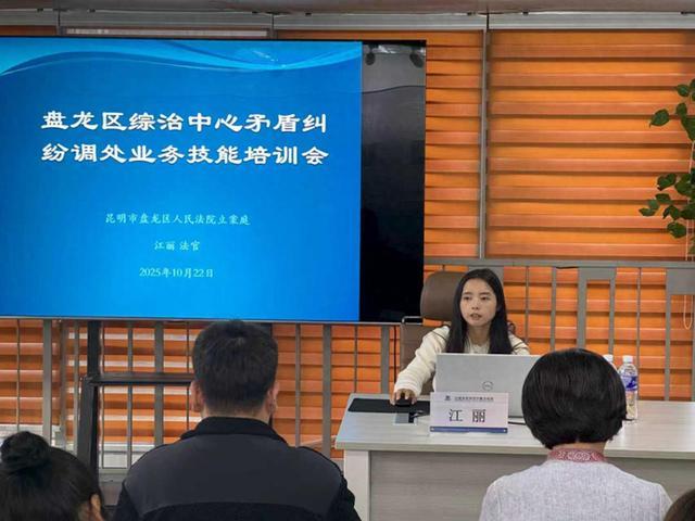 为助力盘龙区综治中心建设,整合多元解纷力量,进一步提升基层调解员业务技能与规范化水平,切实发挥人民法院对人民调解工作的指导职能,10月22日,在中共昆明市盘龙区委政法委的指导下,昆明市盘龙区人民法院(以下简称“盘龙法院”)受邀为盘龙区各派驻单位的二十余名综治中心专职调解员、法治工作骨干,开展盘龙区综治中心矛盾纠纷调处业务技能专题培训。