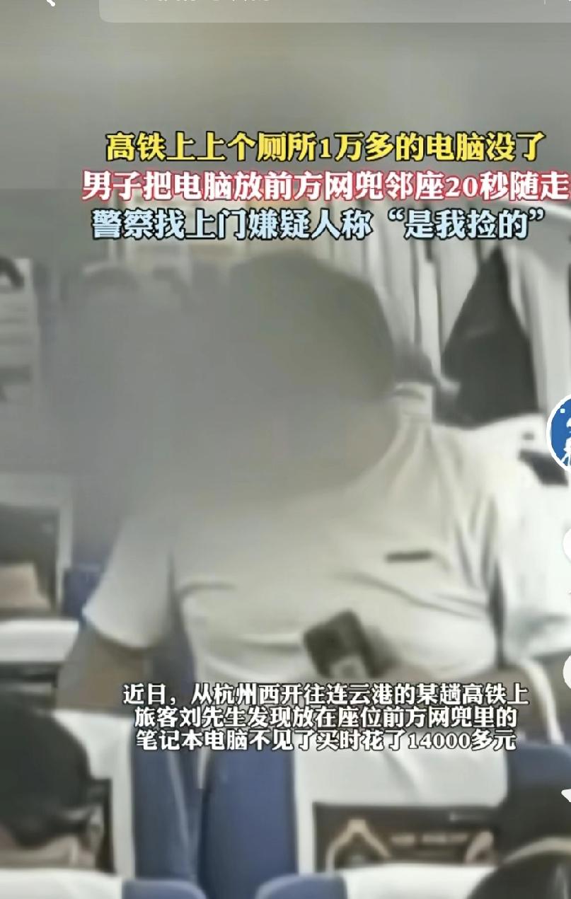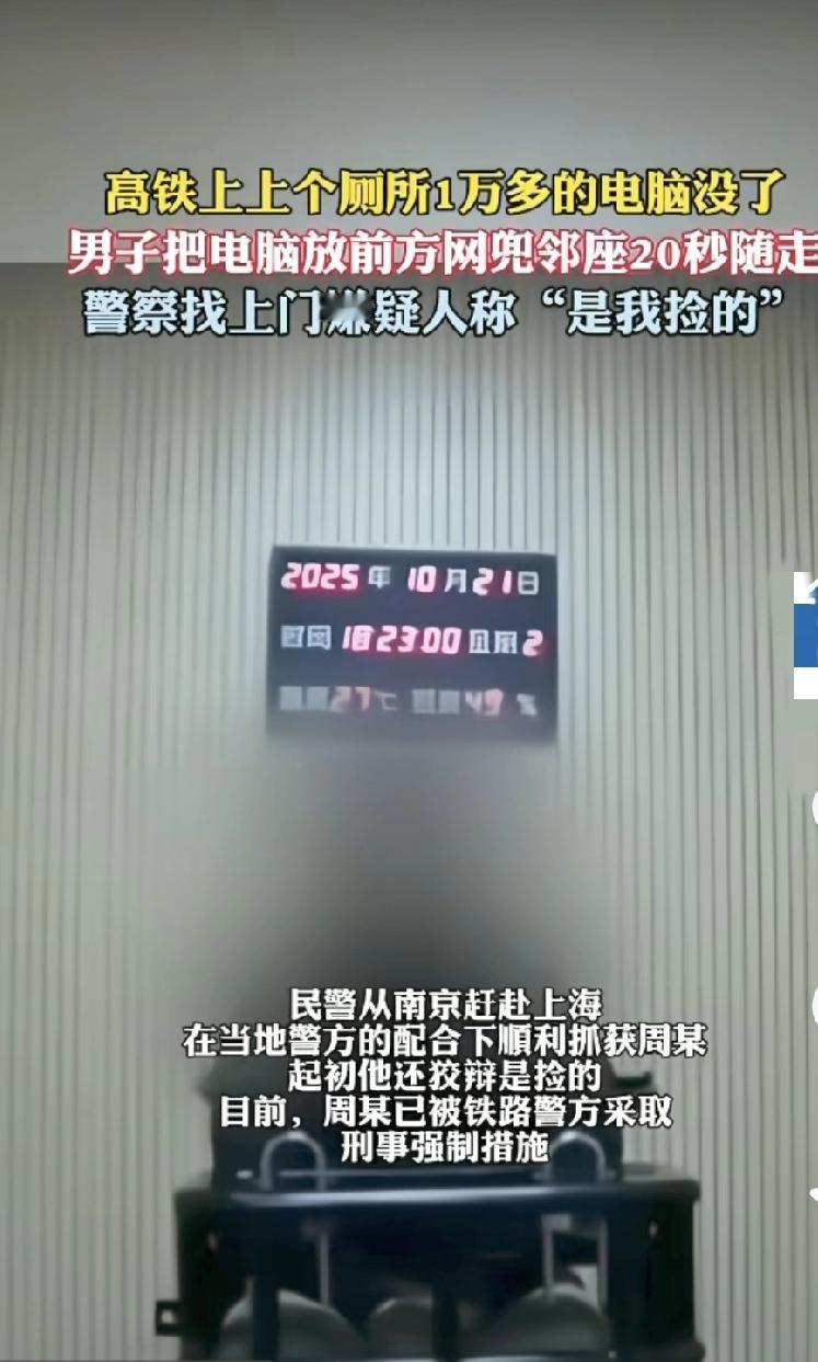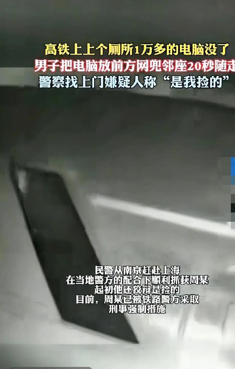 高铁上厕所20秒,1.4万电脑没了!男子被抓还嘴硬 就去趟高铁厕所的功夫,1万4的电脑直接消失?杭州西开往连云港的高铁上,刘先生的遭遇让人大惊失色。他将电脑放在座位网兜,回来时已不见踪影。 监控拍下惊心一幕:邻座周某趁他离开,20秒内就把电脑塞进提包,动作快得像“惯犯”。民警立刻跨省追捕,从南京赶到上海将人抓获。让人无语的是,面对铁证,周某竟狡辩是“捡的”。 目前周某已被刑拘。这事给所有人敲了警钟:高铁网兜、小桌板从不是“保险箱”,上厕所、接水哪怕半分钟,贵重物品也得随身带。你出门会把贵重物品离身吗?评论区聊聊。高铁离谱事件 高铁上蹊跷事件