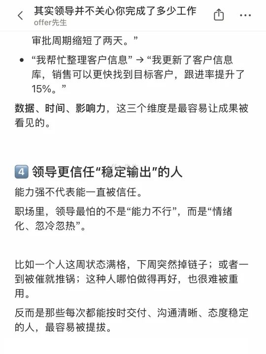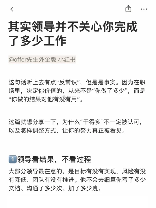 这句话听上去有点“反常识”,但是是事实。因为在职场里,决定你价值的,从来不是“你做了多少”,而是“你做的结果对他有没有用”。 . 这篇就想分享一下,为什么“干得多”不一定被认可,以及怎样调整方式,让你的努力真正被看见。 . 一个认真分享“找工作”干货的账号。真诚、有料、不说空话,只想用真实经历、具体方法,帮大家少走点弯路 .