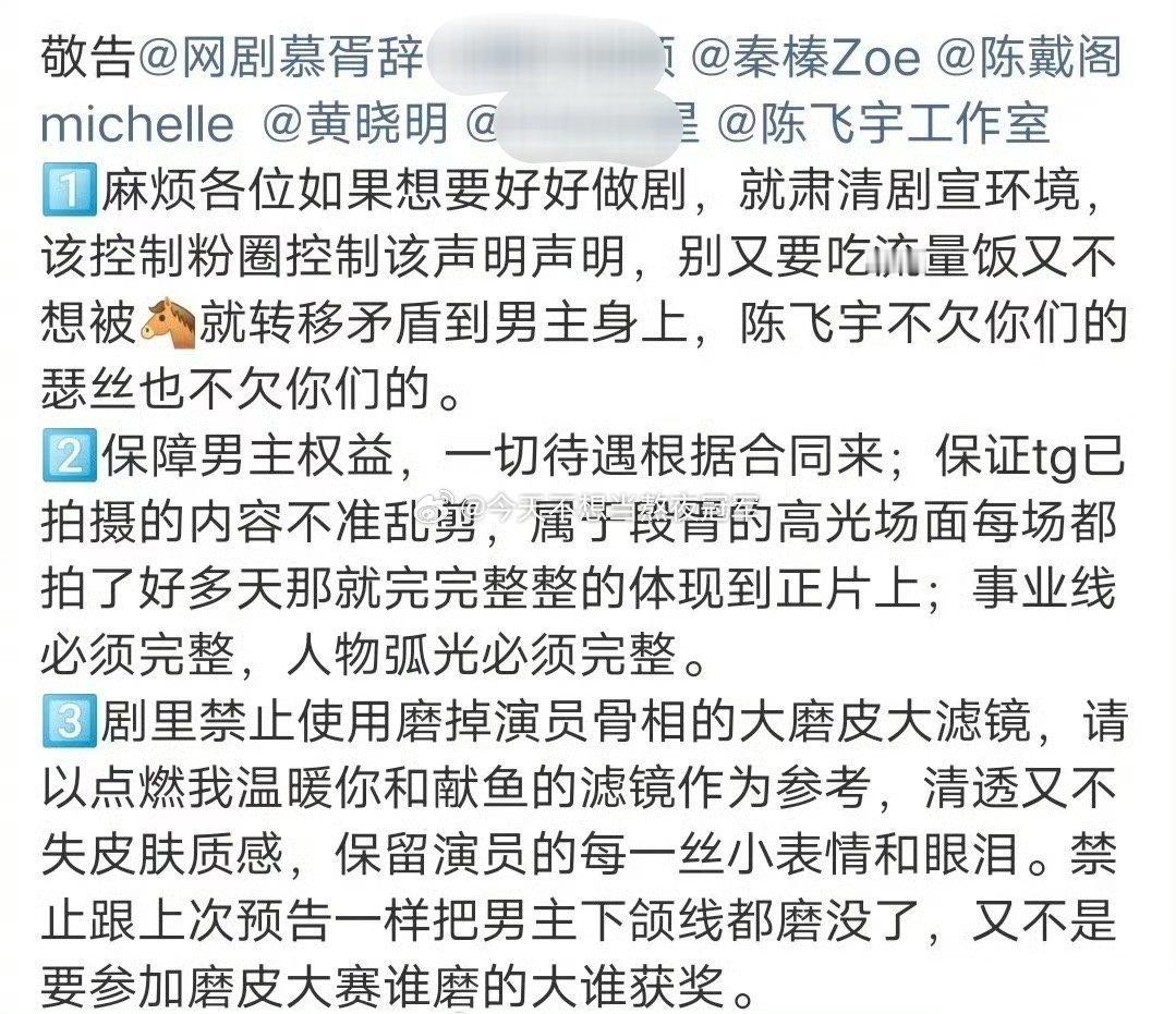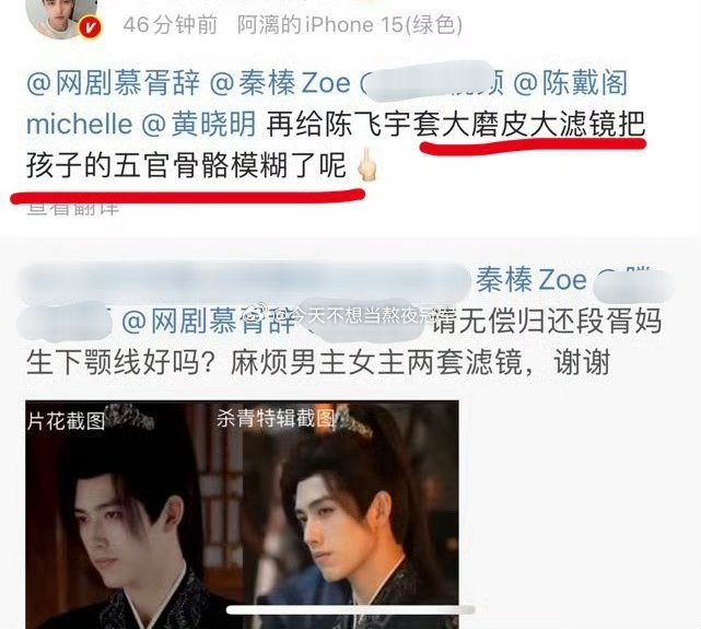 要求《慕胥辞》剧组给男女主用两套滤镜,🈲大磨皮大滤镜,还阿瑟妈生下颌线。