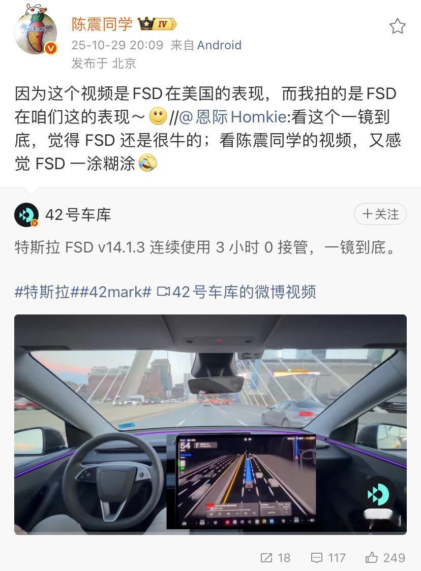 网友:看这个一镜到底,觉得 FSD 还是很牛的;看陈震同学的视频,又感觉 FSD 一涂糊涂[允悲] 陈震:因为这个视频是FSD在美国的表现,而我拍的是FSD在咱们这的表现~[微笑] 网友:震哥,特斯拉FSD这么差,请问这是谁的责任呢?? 陈震:特斯拉收消费者的钱,当然是特斯拉的责任 特斯拉的产品区别实在是太大了,国外的表现和国内的表现完全是不同的产品。啥时候国内的软件能力能提升一大半,然后再支持定义,那特斯拉在国内的竞争力真是突飞猛进。