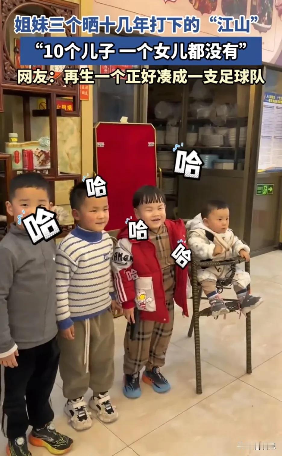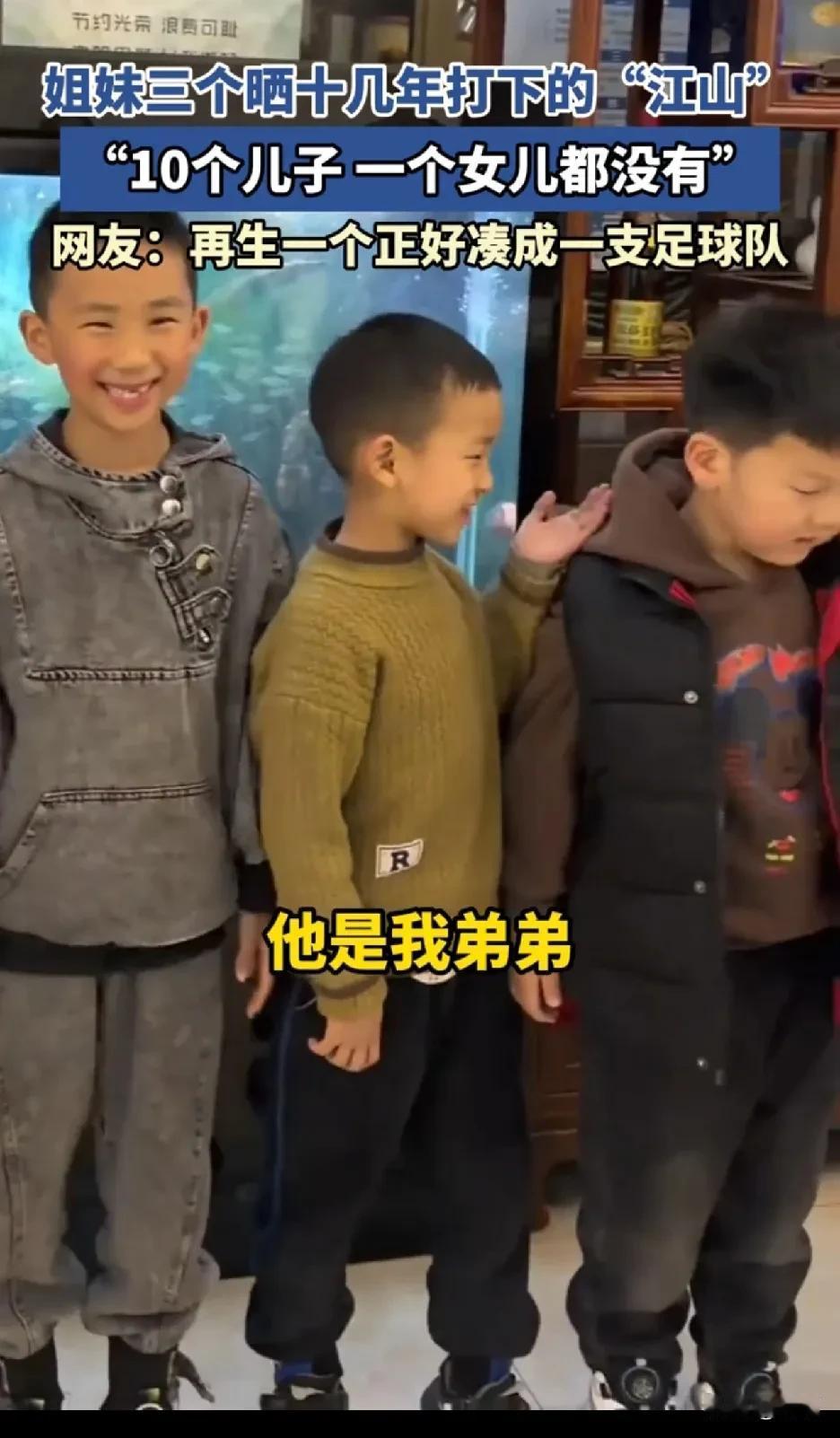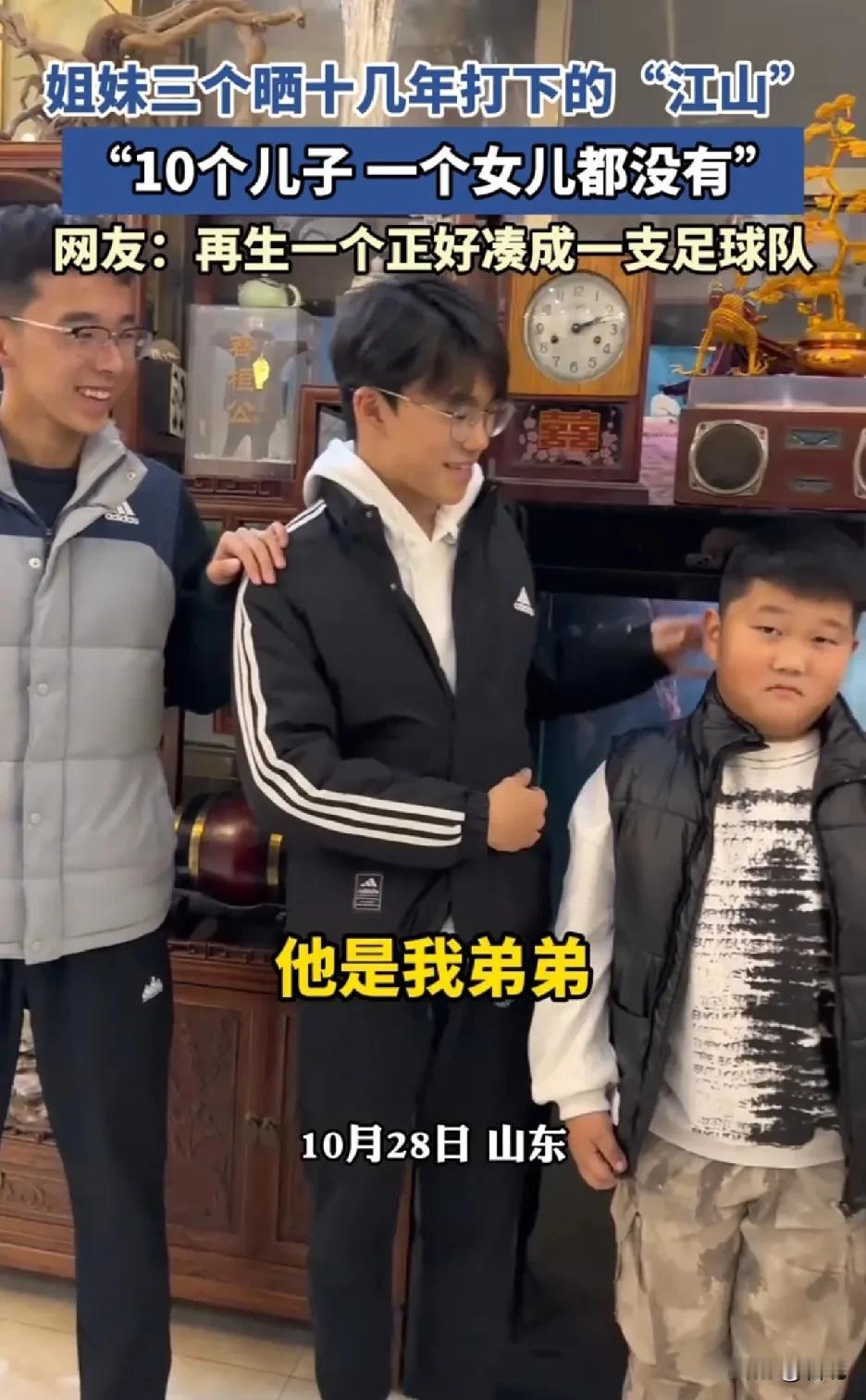 生男生女是“命中注定”? 山东姐妹三人晒十几年打下的“江山” 10个儿子,一个女儿都没有,这是进了“和尚庙”了。 他们不想生女儿吗?肯定不是,不然也不会生那么多个,平均三个人生了三个。但是就是有种很奇怪的现象,一个家族怎么生都是同一个性别。难道这就是“命中注定”? 按理说,生男生女取决于男子的染色体,而XY的占比就跟硬币似的,一半一半的比例。那为什么,有人就是连生儿子呢?查了资料,原来有10%人Y这个染色体的人比X这个染色体要多,所以生儿子的概率会大大提升。这家大概率就是10%的一员。 当然还有其他原因,比如生育年龄、身体状况、环境因素、孕妇的营养状态等等方面。 不过这么多儿子,家里没点家底,真撑不起来。半大小子吃穷老子,养过儿子都知道,青春期的娃饭量大惊人。更别提以后娶妻生子。10个儿10套房10份彩礼10辆车,没点矿真支撑不了。 当然无论生男孩还是女孩,健康就好了,都是父母的心头肉。至于生男孩还是女孩,还是随缘吧!