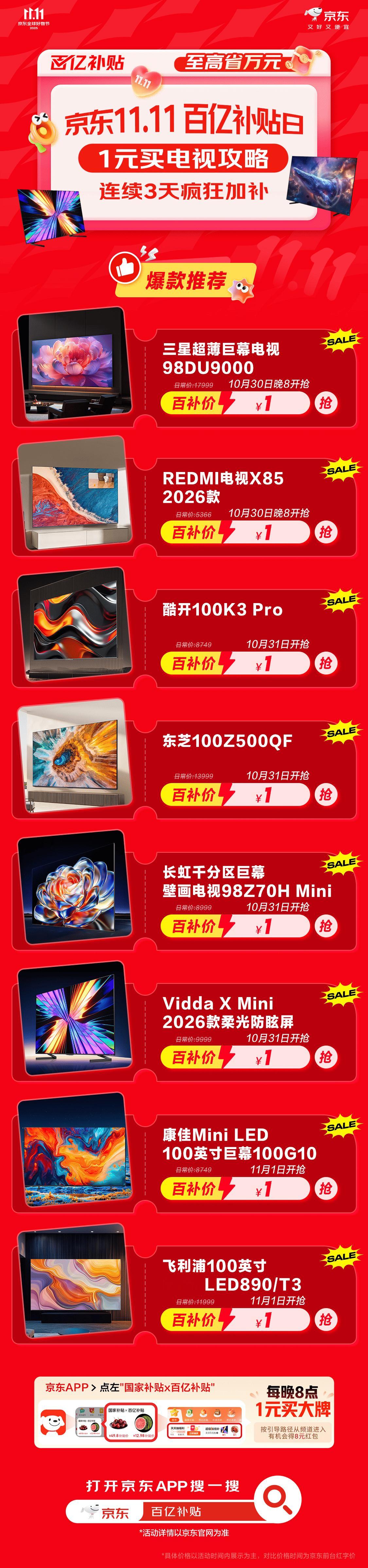 家人们,干饭了!不对,是干货来了!10月30日晚8点,京东11.11连续3天疯狂加补!直接降价不凑单!又好又便宜的11.11只在京东!这次百亿补贴是真下血本,三星、Redmi大电视都有机会1元抢,赶紧上京东App搜「补贴好物」提前加车,至高省万元,1元买电视,这比吃肉还香!今晚8点京东11.11连续3天疯狂加补京东11.11又好又便宜