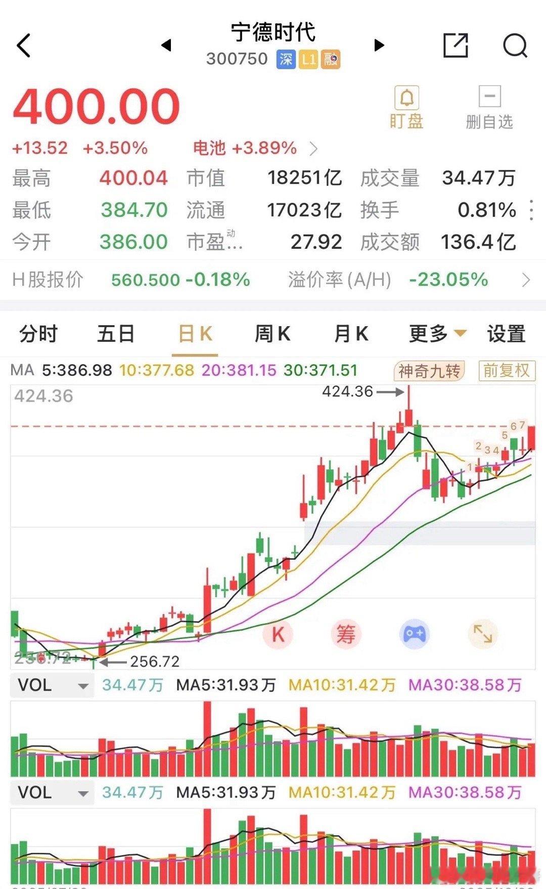 宁德时代再度收上400.0元关口,总市值来到18200亿元,距离2.0万亿元市值仅有10%的距离。