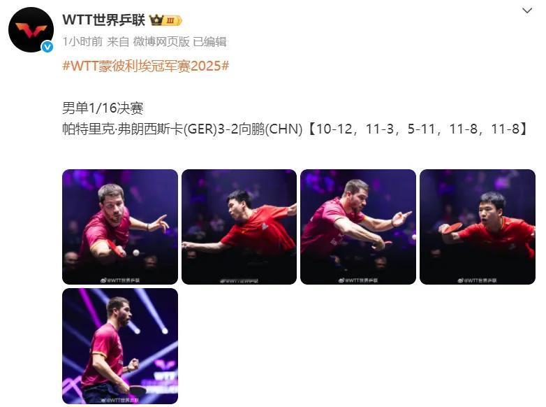 我的天!国乒怎么了?首轮6人出战已淘汰5人,男队全军覆没 在刚刚结束的一场WTT蒙彼利埃冠军赛男单32进16的比赛中,向鹏VS弗朗西斯卡。本场比赛,向鹏没有输球的理由。一来是因为从世界排名上来看,向鹏占优势。最新的世界排名显示,向鹏排在第9位,而弗朗西斯卡排在第19位。二来是因为向鹏的身上肩负着国乒男队的荣耀。之前,温瑞博和陈垣宇在比赛中输球,以至于国乒男队只剩下向鹏了。 而且,就从硬实力来看,向鹏也是占优的。然而,比赛的结果出乎意料。前三局来看,向鹏的发挥还是蛮不错的。尽管他在第二局中被打了一个11-3,但是他占据了场上的主动权。然而,到了后两局向鹏的发挥就有点失水准了。关键时刻,向鹏总是难以把握住机会。自己没抓住机会,那么机会就是别人的。最后依靠两个11-8,弗朗西斯卡锁定胜局。 最终,向鹏以2-3的比分不敌弗朗西斯卡,无缘晋级男单16强。向鹏出局后,国乒遇到了一个非常尴尬的局面。第一,国乒男队全军覆没。在之前的比赛中,男单的温瑞博和陈垣宇出战。这两位的年龄小,但是实力不错,而且被寄予厚望。未来,国乒还要靠他们打天下呢!遗憾的是,经过一通输出,他们两个殊途同归,都是以1-3的比分输给了韩国球员。本次比赛,国乒男队就来了3人,全部一轮游。 第二,国乒6人亮相5人出局。在已经开打的比赛中,国乒有6名球员亮相,分别是男单的温瑞博、陈垣宇、向鹏,女单的陈幸同、蒯曼、王艺迪。结果,除了王艺迪成功晋级下一轮,其余的选手全部出局。值得一提的是,陈幸同和蒯曼分别是女单比赛的头号种子和二号种子。如此狼狈的局面,在国乒的历史上绝无仅有,实在不知道大家究竟是怎么了?如果是发挥低迷,怎么会都这般低迷? 此时此刻,王皓应该最难受。没有了樊振东、王楚钦和林诗栋等人,国乒男队真的不行吗?