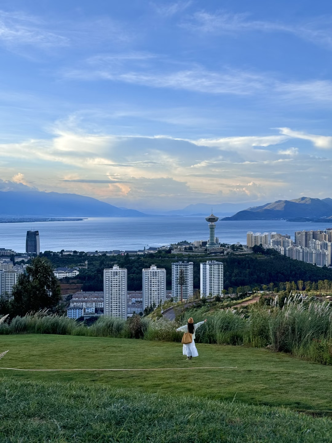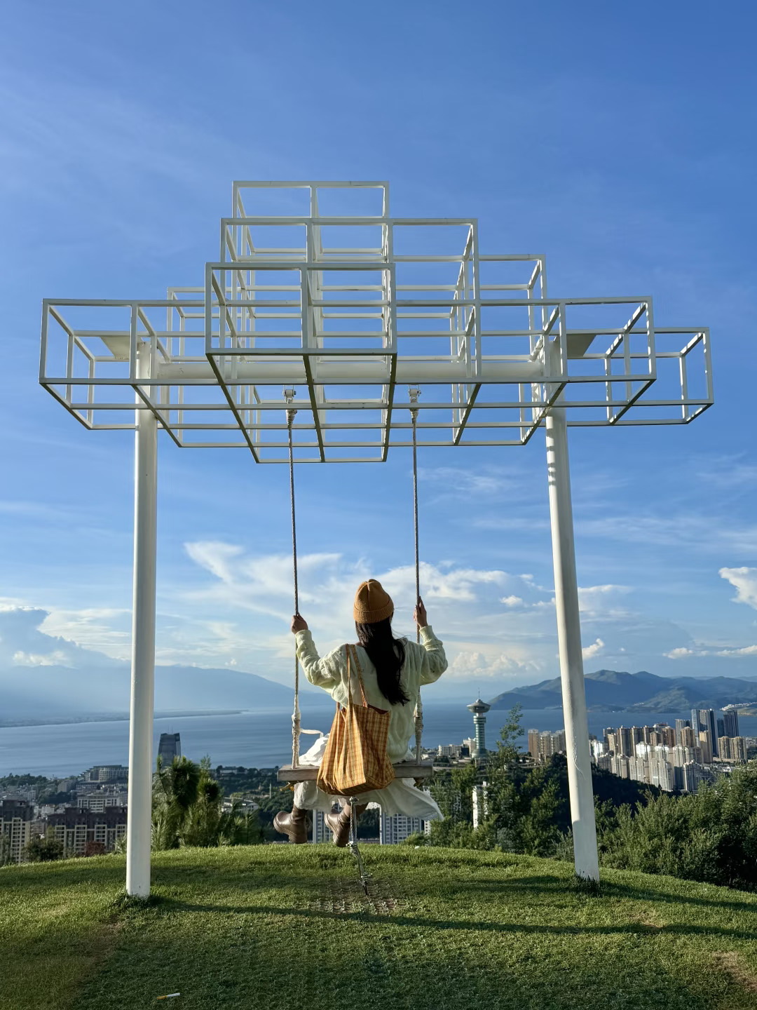 有面向悬崖的礼堂、秋千,还可以毫无遮挡地俯瞰整个大理市区和洱海全景。当日落的余晖将天空、洱海和城市染成金色,真的好浪漫!