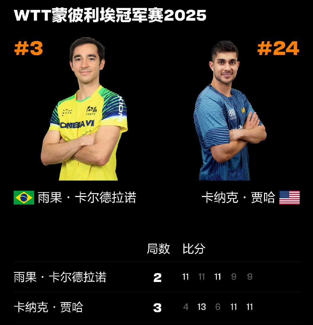天哪,谁能想到啊[捂脸], 男单一号种子雨果🇧🇷惨遭一轮游! 就在刚刚,是25岁、世界排名第24位的美国选手卡纳克·贾哈🇺🇸3-2爆冷击败世界排名第三位的雨果🇧🇷,奇迹般晋级WTT冠军赛蒙彼利埃站男单十六强,五局比分为:4-11,13-11,6-11,11-9,11-9。 熬夜的球迷有幸见证了本站头号种子一轮游,尤其是国乒男队球迷,真像冷宫里的妃子,看别人宫斗,滋味酸爽[捂脸]。 雨果的女友高桥布鲁娜也在现场观看雨果比赛,开始是激动,后来是惊呆。 这蒙彼利埃魔幻的很,连连“爆冷”,美国选手贾哈是青奥三子之一,就是之前被禁赛了一段时间,复出后进步也蛮快的。 现在激动兴奋的贾哈和雨果相比,就是差个漂亮女友了[吃瓜群众]。 不过今天果子哥你最后一局打得真的有点慌了。 蒙彼利埃魔幻就魔幻到底,男线二号种子也爆冷就好了[捂脸]。 下一轮:卡纳克🇺🇸VS李尚洙🇰🇷!