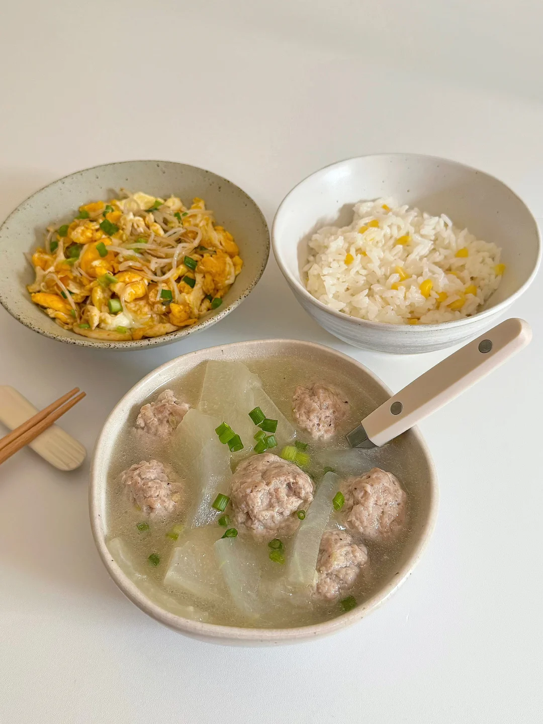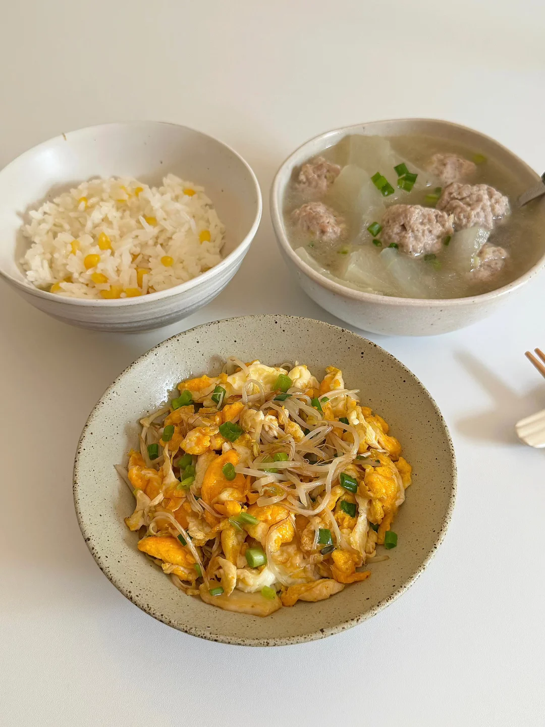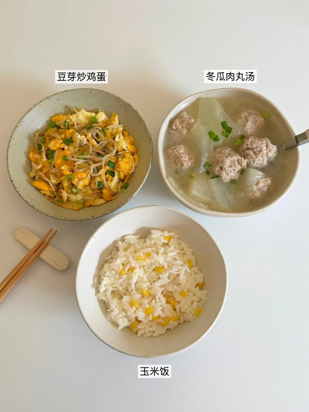 这样吃真的好舒服!! 冬瓜肉丸汤+豆芽炒鸡蛋+玉米杂粮饭 有肉有汤,有饭有菜~营养美味! 干净清淡,却又不失滋味! 肠胃和身心都巨满足[萌萌哒R] . 如果不知道吃什么,可以来试试这个搭配~ 秋冬季节真的好适吃肉丸汤! . 很喜欢这样平淡又快乐的生活状态! 🥬 所需食材:猪肉/牛肉、冬瓜、豆芽、鸡蛋、大蒜/小葱 具体做法在P5&P8哦~ 也期待各位的美食灵感分享!