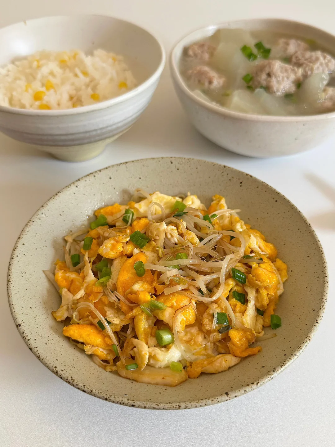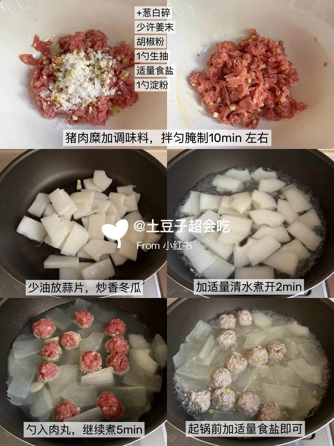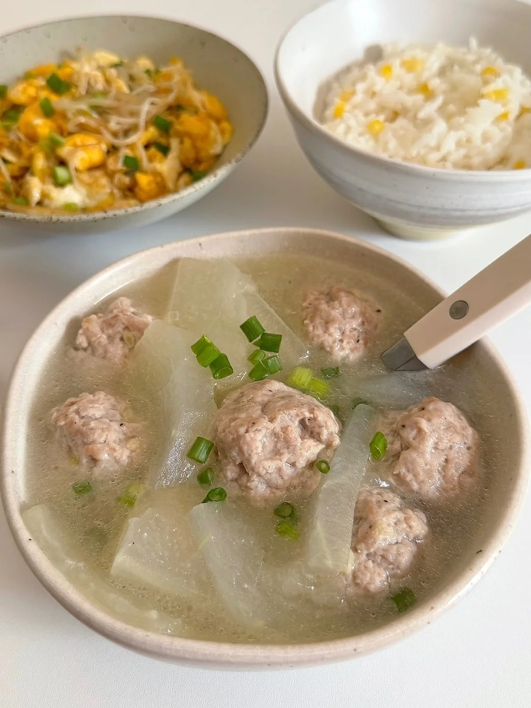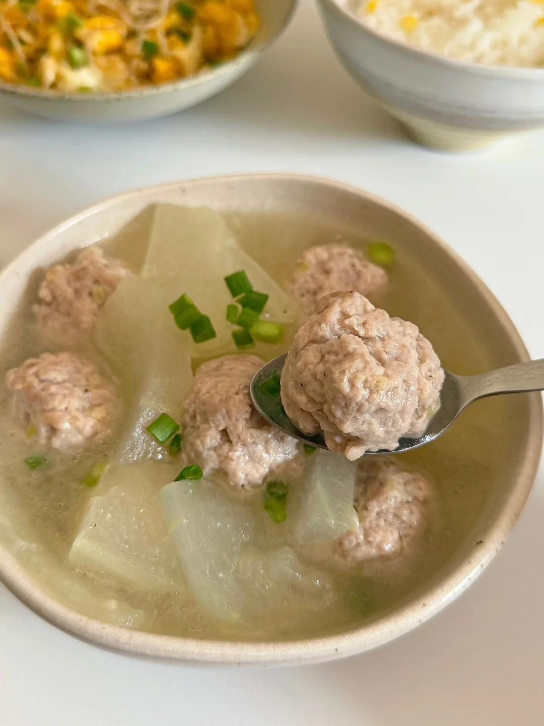 这样吃真的好舒服!! 冬瓜肉丸汤+豆芽炒鸡蛋+玉米杂粮饭 有肉有汤,有饭有菜~营养美味! 干净清淡,却又不失滋味! 肠胃和身心都巨满足[萌萌哒R] . 如果不知道吃什么,可以来试试这个搭配~ 秋冬季节真的好适吃肉丸汤! . 很喜欢这样平淡又快乐的生活状态! 🥬 所需食材:猪肉/牛肉、冬瓜、豆芽、鸡蛋、大蒜/小葱 具体做法在P5&P8哦~ 也期待各位的美食灵感分享!