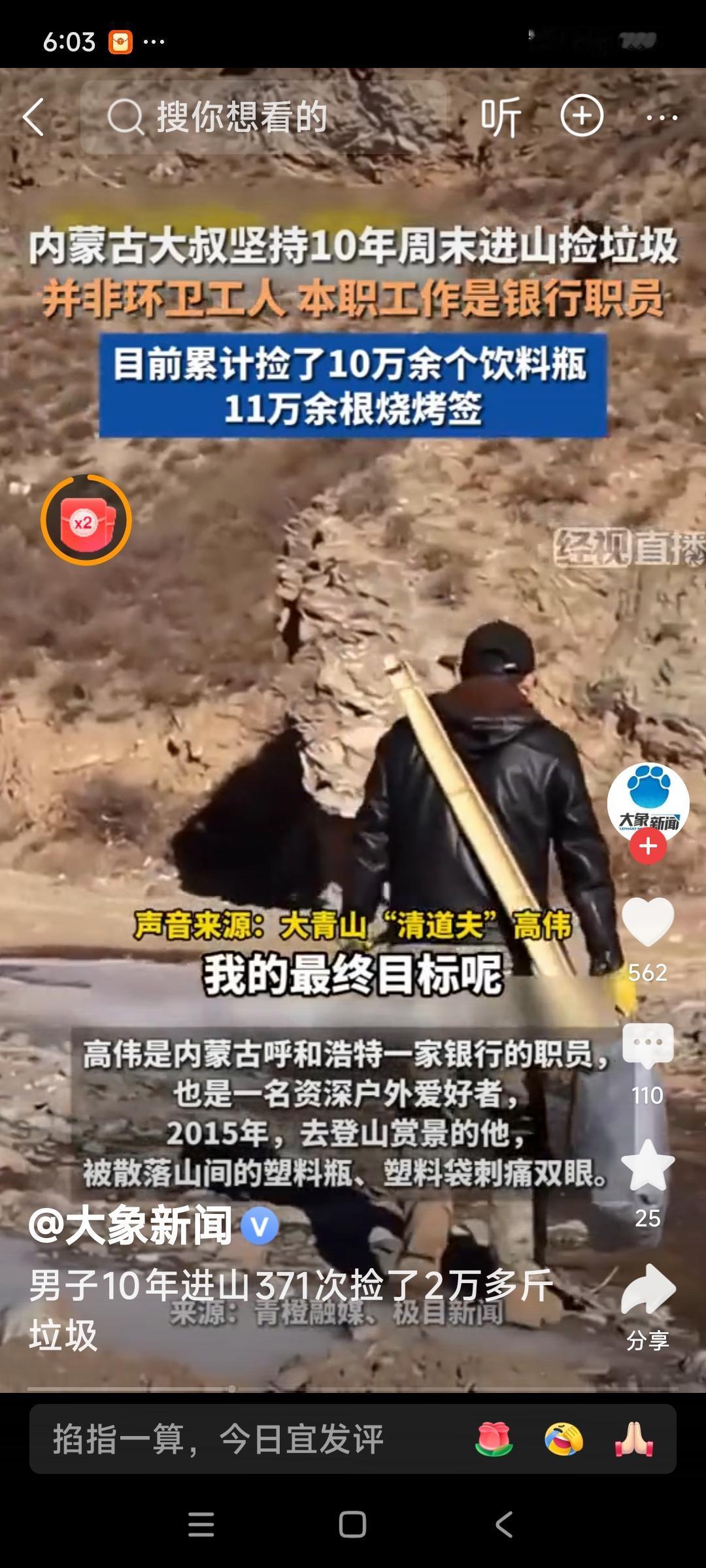 男子10年进山371次捡了2万多斤垃圾 这种善举,真的应该传下去。社会在进步,科技、经济发展得快,但文明也得跟上。环境好了,大家的生活质量才能真正提升。如果人人都能像这位男子一样,从小事做起,比如不乱扔垃圾、参与环保活动,那我们的家园肯定会更美。反过来,要是只顾自己方便,垃圾随手扔,山川河流迟早会“喊疼”。 十年371次进山,2万斤垃圾背后,是比青山更干净的人心! 有人追山巅的风景,有人守山间的洁净。这位无名男子用十年光阴,把371次进山的脚步,踩成了最动人的环保诗行,将2万斤垃圾带出山林,让每片落叶都能安心归土,每缕清风都不含杂质。 (图片全部来自网络侵删)