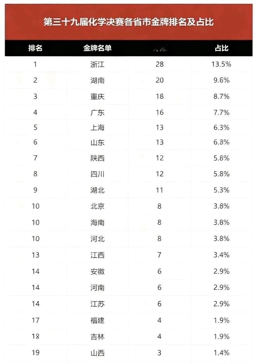 2025年第39届全国中学生化学竞赛决赛成绩统计出炉,北京共获得8枚金牌,其中中国人民大学附属中学5枚,北京市第八中学2枚,北京市第十二中学1枚。 金牌榜前三名的省份是浙江28人、湖南20人和重庆18人。金牌榜前三名的学校是广东深圳中学10人、海南海口中学8人和湖南长郡中学8人。北京的人大附中未进入前五。 海口中学以前还说是黑马,现在已不是黑马了。去年开始在湖南教练的帮衬下,就已经拿下了国际金牌了。这个教练不知道还能在海南待几年,估计都在暗中抢。有好的教练在,就一直会有好的结果输出。竞赛教练太重要了,真正的稀缺资源。你看,他硬是把竞赛弱省海南拉出一条王者之道! 北京五大学科竞赛获得金牌数估计遭遇小年是铁定的了,2025年第39届化学竞赛决赛金牌相比2024年少了2枚;2025年第42届全国中学生物理竞赛决赛,北京获得7枚金牌14枚银牌,相比2024年少了3枚金牌,1枚银牌。 按理说,北京不缺天才少年,不缺资金请优秀教练,问题出在哪?天才少年没能匹配到合适的教练?北京其他学校真应该学习下海口中学的突破之路。