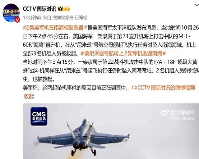 就离谱。 半小时,前后脚,两架。 一架海鹰直升机,一架大黄蜂战斗机。 噗通,噗通,全掉南海里了。 在咱们家门口这么折腾,又是演习又是巡航的,图啥呢? 结果倒好,自己给自己加戏,演了个“双响跳水”。 你说这航母,“尼米兹”号,听着挺唬人。 结果呢?甲板是不是有点滑?还是说飞行员今天水逆? 不到一个钟头,连着折损两员大将。这维护保养水平,这战备状态,真让人捏把汗。 还好人没事,万幸。 但那两坨几千万、上亿美元的铁疙瘩,就这么喂鱼了。 这事儿吧,越想越觉得像个寓言故事。 肌肉秀得太频繁,是会拉伤的。 船开得太远,老在别人家晃悠,精神也容易恍惚。 有些东西,不是靠几艘船、几架飞机就能证明的。 潮水来了又去,最后留在沙滩上的,才是真东西。 踏踏实实做好自己的事,比啥都强。