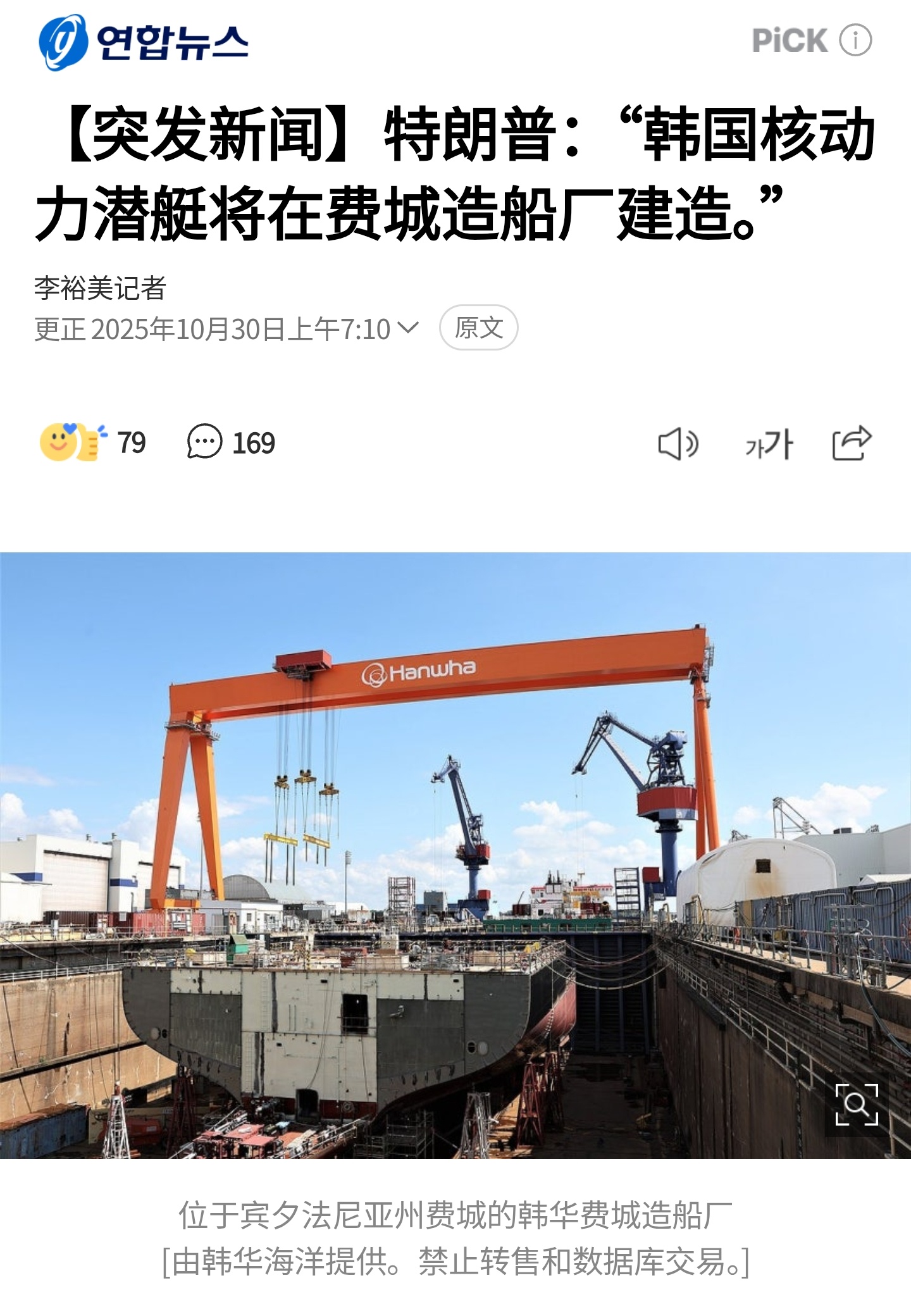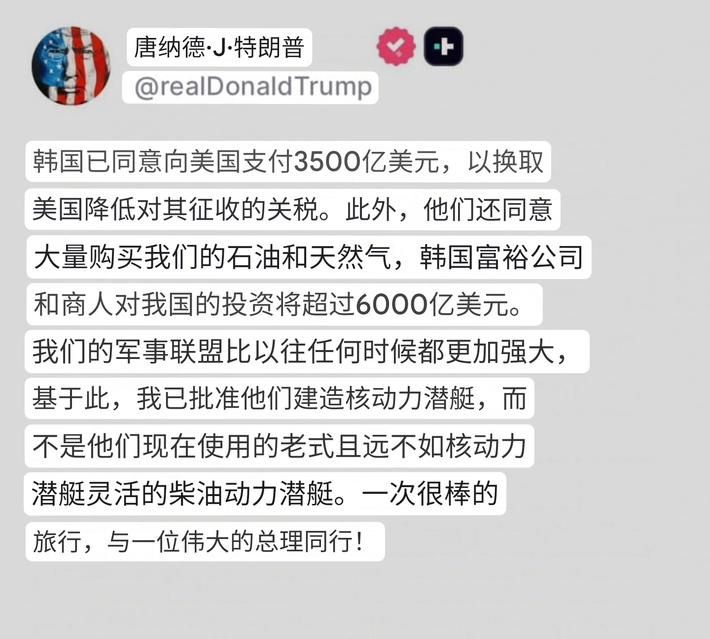 特朗普:韩国要给美国支付3500亿美元甚至更多,我批准他们造核潜艇,不过要在韩国韩华海洋收购的美国费城船厂建造。而在此前的10月14日,因韩华海洋株式会社在美相关子公司协助、支持美国政府相关调查活动,危害我国主权、安全、发展利益。中国政府决定制裁已经在美国开展造船业务的韩华海洋株式会社5家美国相关子公司。 反制韩华海洋株式会社5家美相关子公司