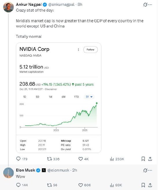 一位网友在社交平台X上转发了英伟达市值一度突破5.1万亿美元的截图,特斯拉CEO埃隆·马斯克也不尽发出赞叹之声。